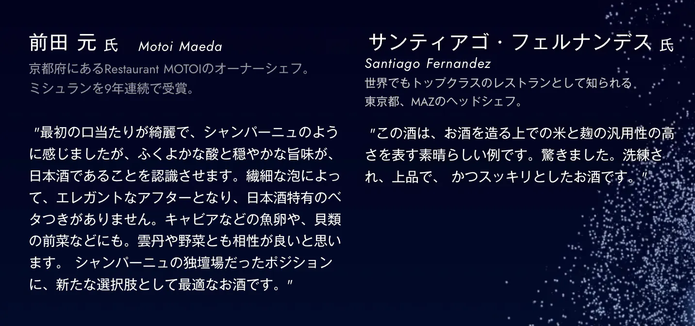 その卓越した味わいは、すでにパリの美食家たちをも魅了し、マンダリン・オリエンタルの二つ星レストラン「シュル・ムジュール」のチーフソムリエをして「シャンパーニュさえも想起させる奥深さ」と言わしめました。