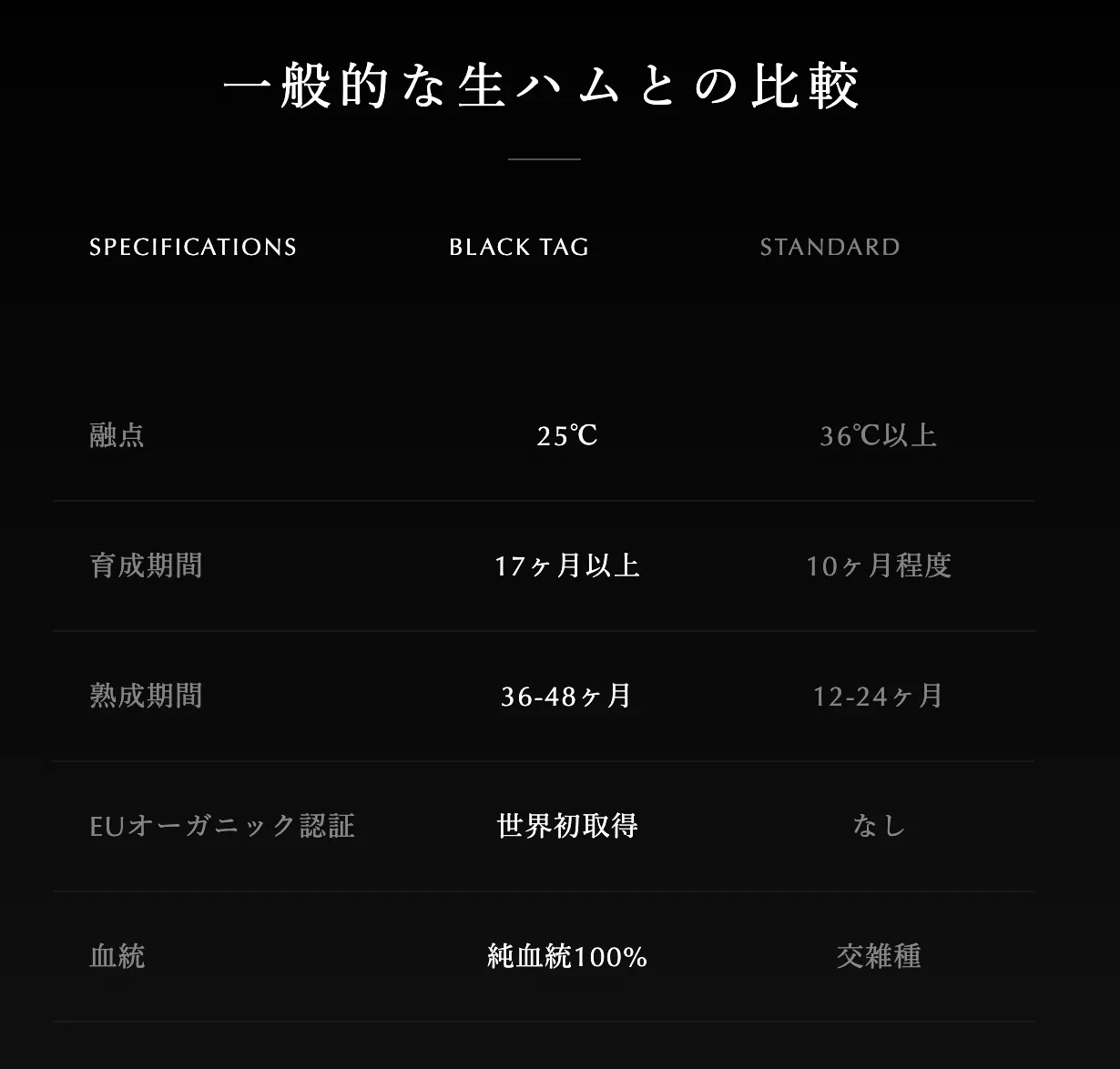 一般的な生ハムの融点が36℃、さらに牛肉でさえ45℃という事実を考えれば、25℃という驚異的な温度で溶け出す脂の存在は、まさに奇跡と呼ぶほかありません。