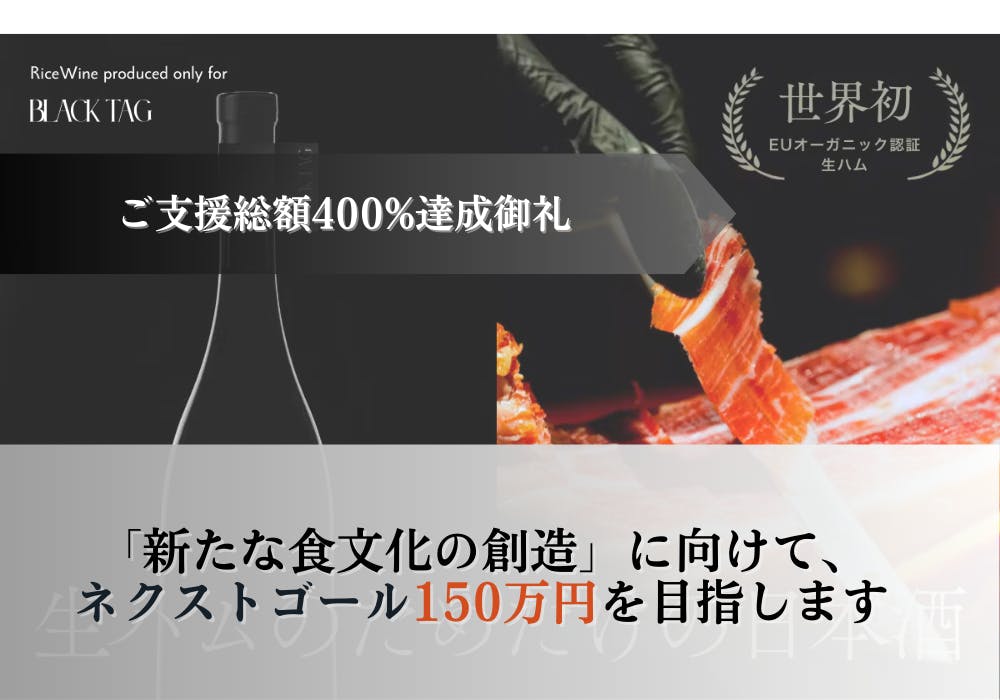2025/01/26 13:51【400%達成の御礼。新たな挑戦へ】皆様の温かいご支援のおかげで、プロジェクトは目標金額の400%を達成することができました。心より御礼申し上げます。この驚くべき反響は、「新しい食文化の創造」という私たちの挑戦に、多くの方が共感してくださった証だと感じています。そして今、私たちは新たな目標として、ネクストゴール150万円に向けて歩みを進めてまいります。【400%達成記念特別リターンのご案内】 多くの方々からのご要望にお応えし、最もご好評をいただいております『Exclusive Edition』を、数量限定特別価格でご用意いたしました:『Exclusive Edition』 ・ハンドカット2種(ベジョータ&セボカンポ) ・スライス3種(パレタ・サラミ・チョリソ) ・特別醸造酒720ml 通常30,000円相当 → 27,000円(3,000円お得) ※限定10セット25℃という驚異的な温度で溶け出す生ハムと、その芳醇な味わいのために特別に醸造された日本酒。この唯一無二の出会いが織りなす体験を、より多くの方々と分かち合えることを願っています。バイオテクノロジーの粋を集めた最高級生ハムと、475年の歴史を持つ酒蔵から生まれた革新的な日本酒。伝統と革新が出会い、響き合うことで生まれる新しい贅沢のかたちを、引き続き追求してまいります。皆様のさらなるお力添えを賜りますよう、心よりお願い申し上げます。SHIROKIMONO×BLACK TAG 「生ハムのためだけの日本酒」プロジェクトメンバー一同 もっと見る