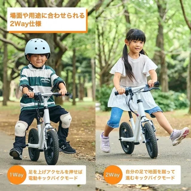 A2.【2WAY仕様】 バッテリーが切れても、電源OFFで通常のキックバイクとして使用可能!電動化の力で、キックバイクより長く、自転車とも違う楽しさを提供します。