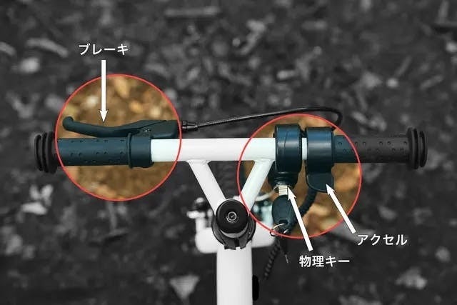 電動キックバイクとして使用する際は、まずハンドル部にあるカギを挿し廻します。次に本体下部にある電源ボタンを長押しし電源をつけます。
