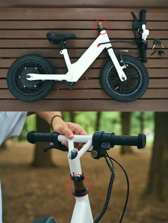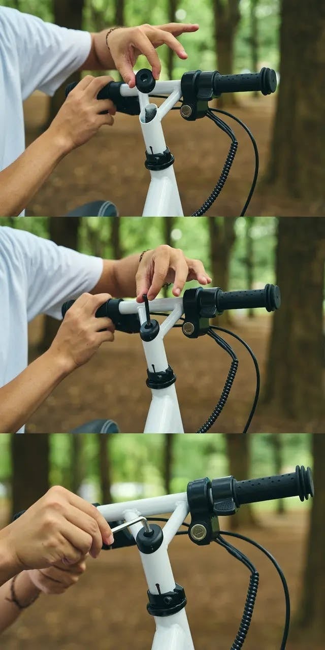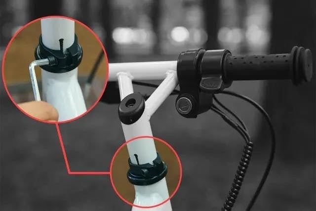 - ハンドルの上部を六角レンチで固定できたら、次にその下の箇所も同様に六角レンチを使い固定します。ここを固定することでハンドルとタイヤが連動されます。この時、ハンドルとタイヤが垂直となるようにタイヤの向きを確認してから固定を行なってください。