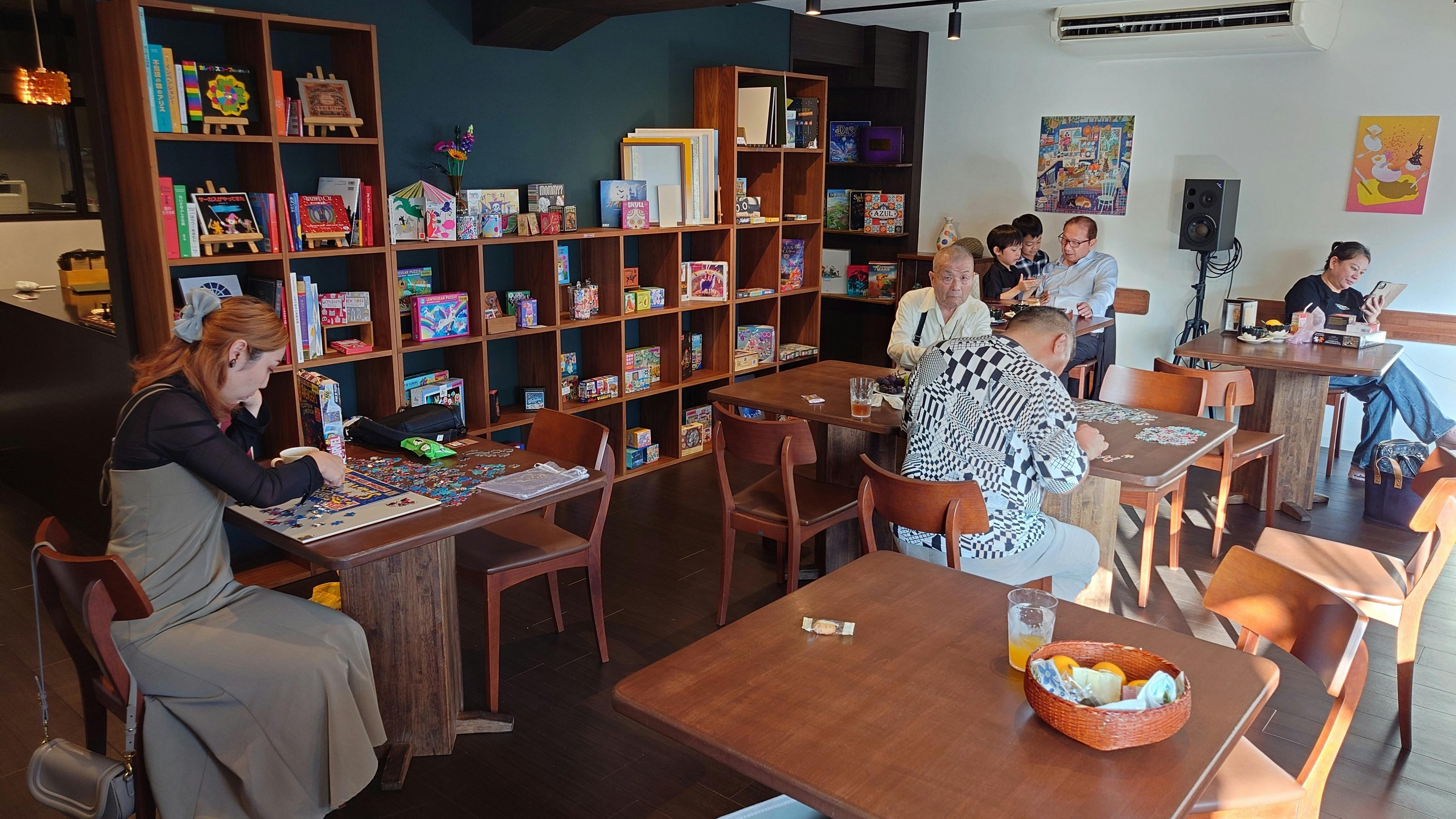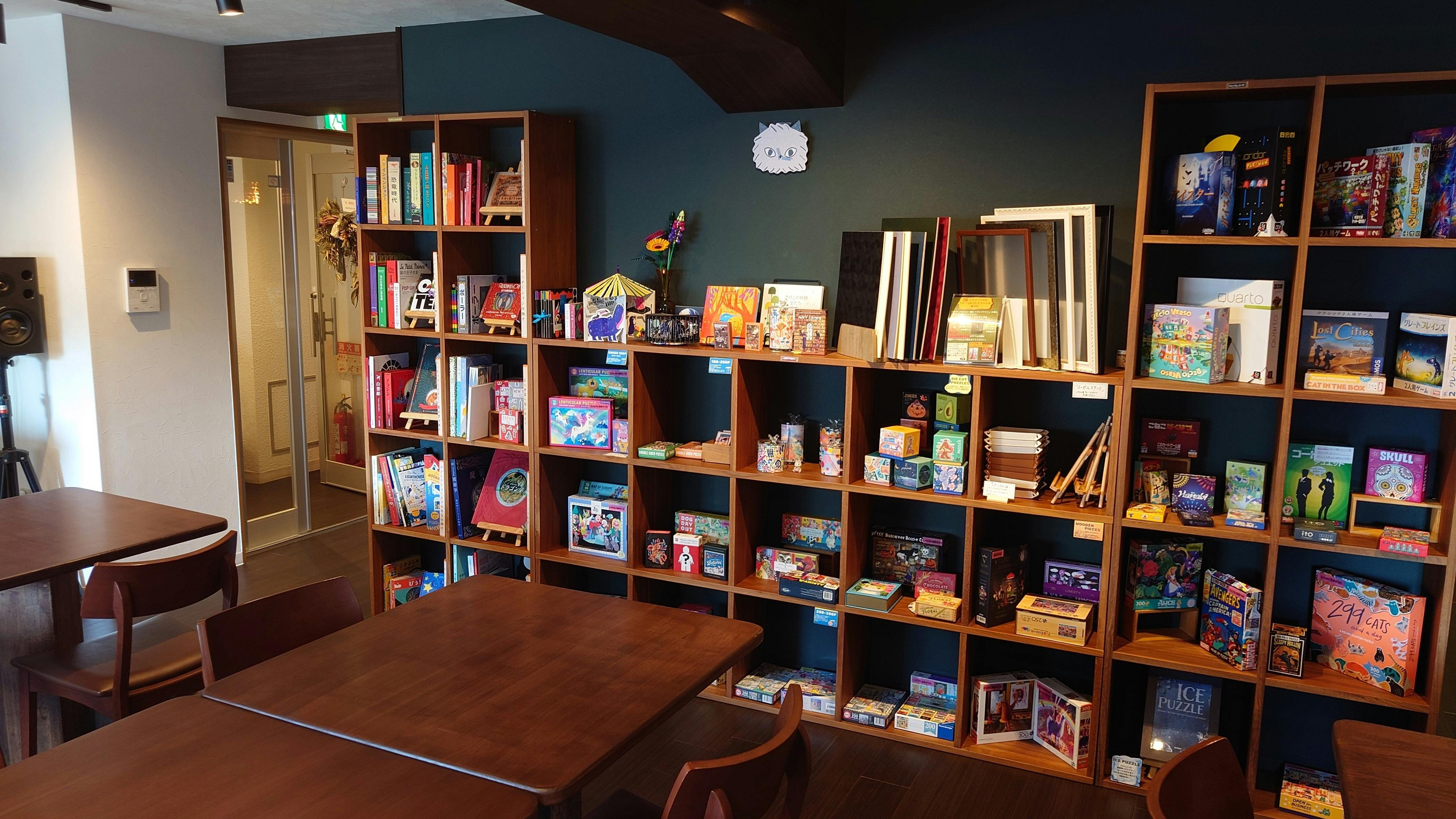 日本や世界でも非常に珍しい『仕掛け絵本』『ジグソーパズル』『ボードゲーム』を自由に手に取って遊べるカフェとして営業しております。この三種類が揃ったカフェというのは関西初、あるいは日本初や世界初かも知れません。