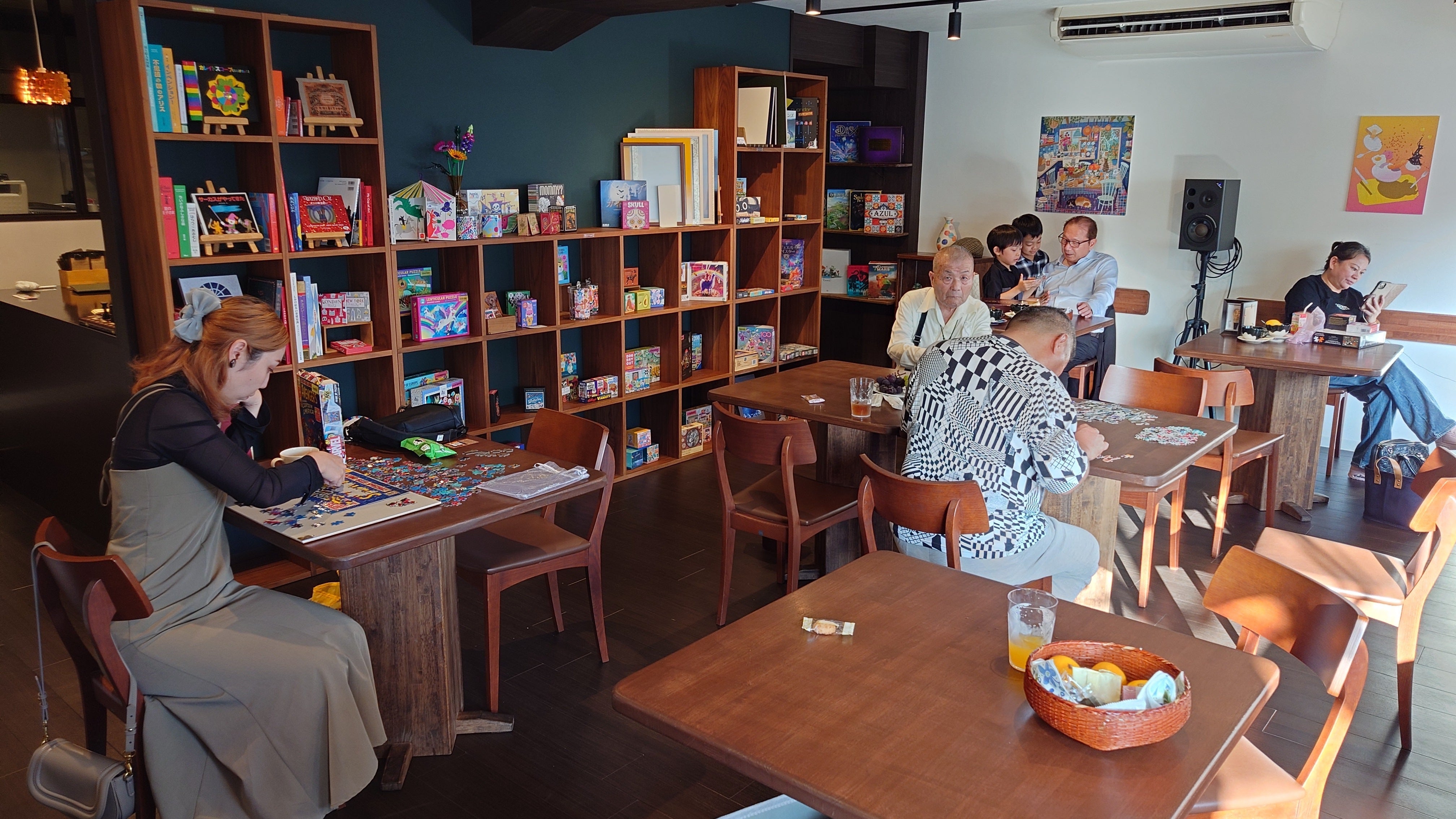 日本や世界でも非常に珍しい『仕掛け絵本』『ジグソーパズル』『ボードゲーム』を自由に手に取って遊べるカフェとして営業しております。この三種類が揃ったカフェというのは関西初、あるいは日本初や世界初かも知れません。