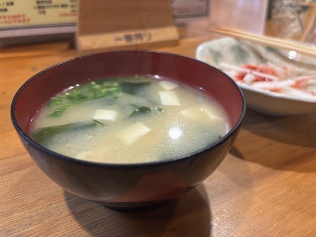 ワカメ、豆腐、玉ねぎの入った甘めのお味噌汁。
