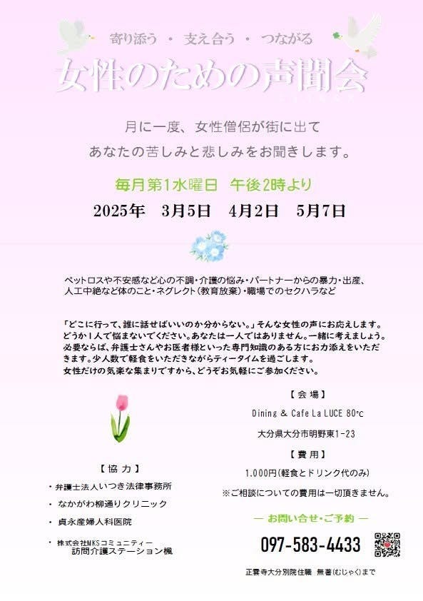 幸せのしっぽなど動物の保護活動のお手伝いや、女性の悩み相談、声聞会も月に一度開催されています。(微力ですが私もお手伝いさせて頂います。毎月、第一水曜日、詳しくはHPをご覧ください)