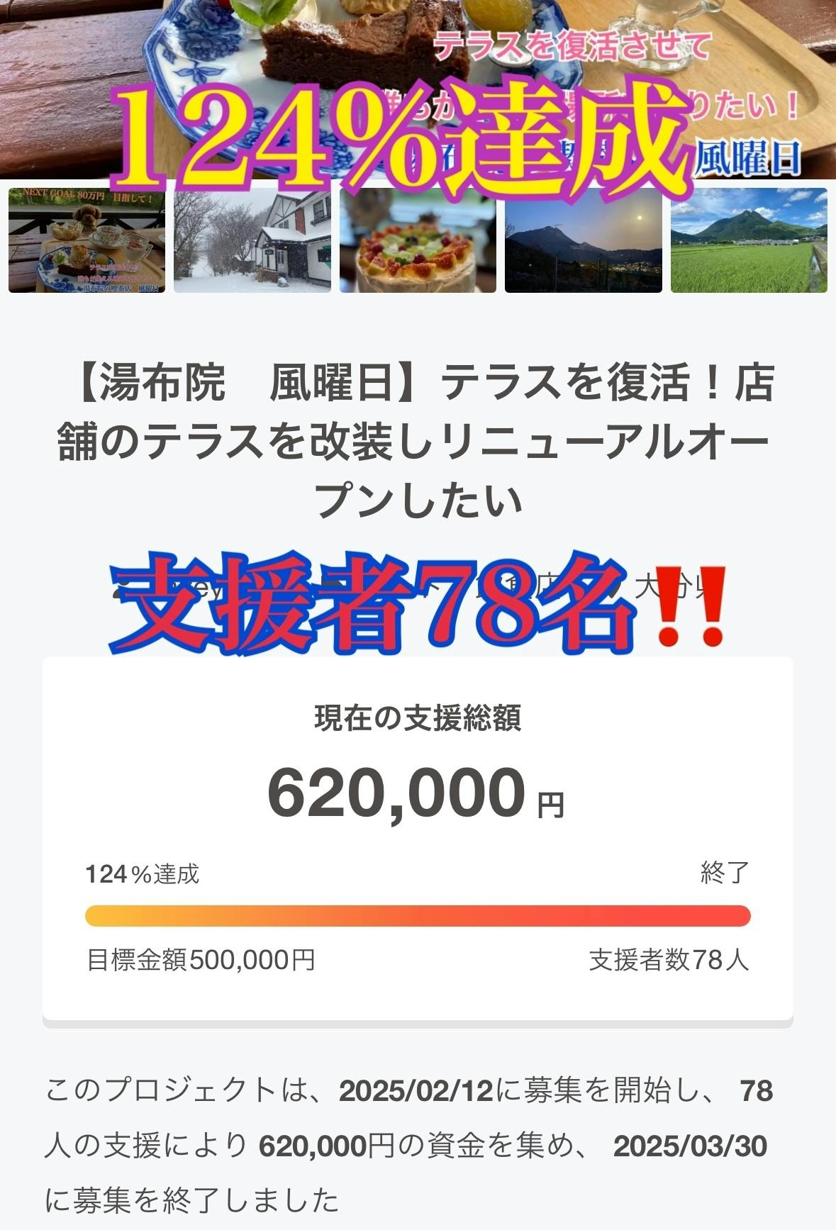 このプロジェクトは、2025/02/12に募集を開始し、 78人の支援により 620,000円の資金を集め、 2025/03/30に募集を終了しました