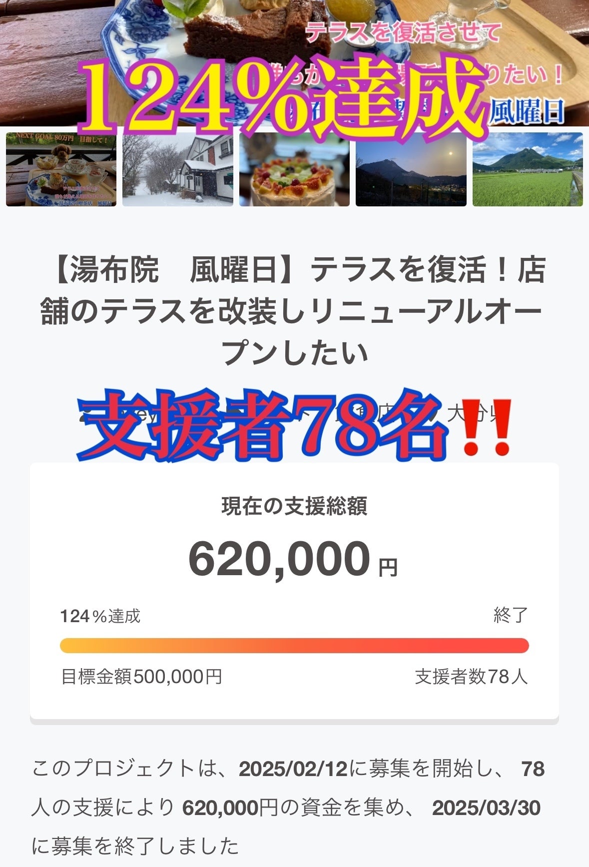 2025/03/31 19:54この40日間、たくさんのご支援、応援ありがとうございました♪ネクストゴールには残念ながら届きませんでしたが、78名もの方々に支援いただき、暖かい言葉もいただき、本当に暖かく励みになりました。感謝しかありません。新しくなったテラスでみなさまのお越しを心よりお待ちしております!取り急ぎお礼まで。明日から新年度。みなさまにとっても、新しい出会いが溢れる良い年になりますように!本当にありがとうございました!! もっと見る