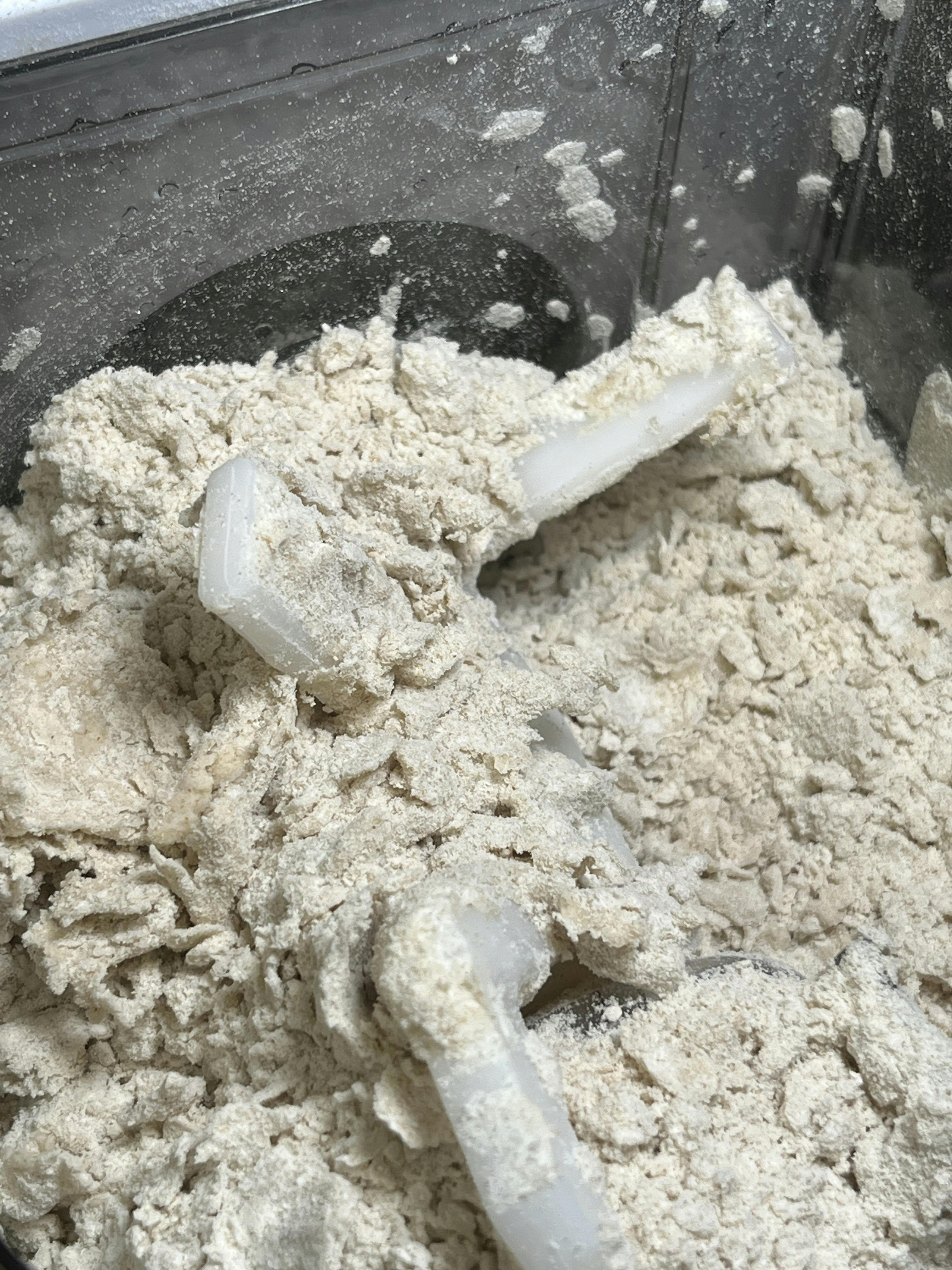これを蕎麦と2:8の割合になるように加えて、全自動生パスタメーカーの「こねる」モードでしっかりと粉同士を混ぜ合わせます。最初から全自動にしなかった理由は、十分に混ざり合っていないと途中で切れる原因になるからです。
