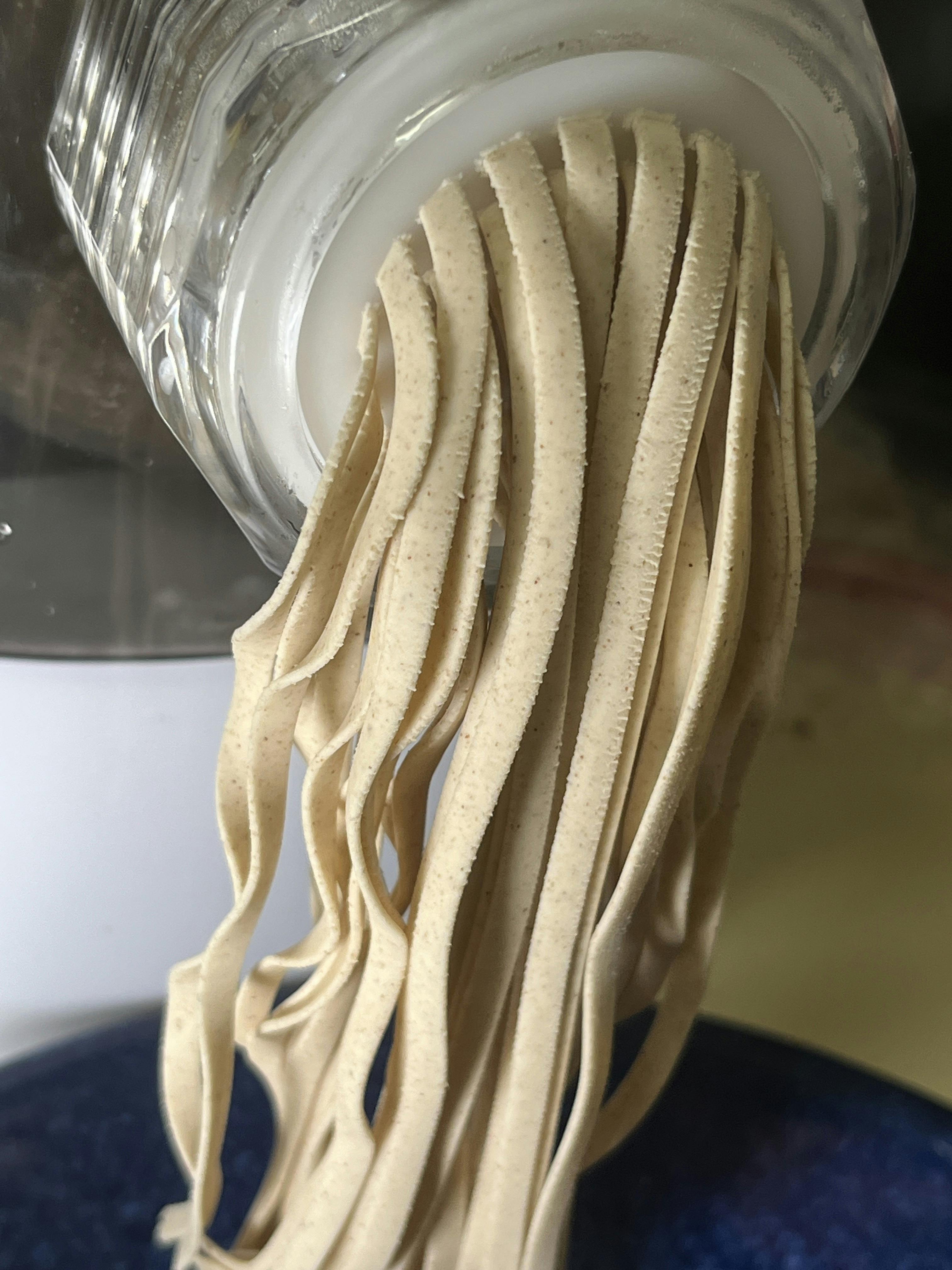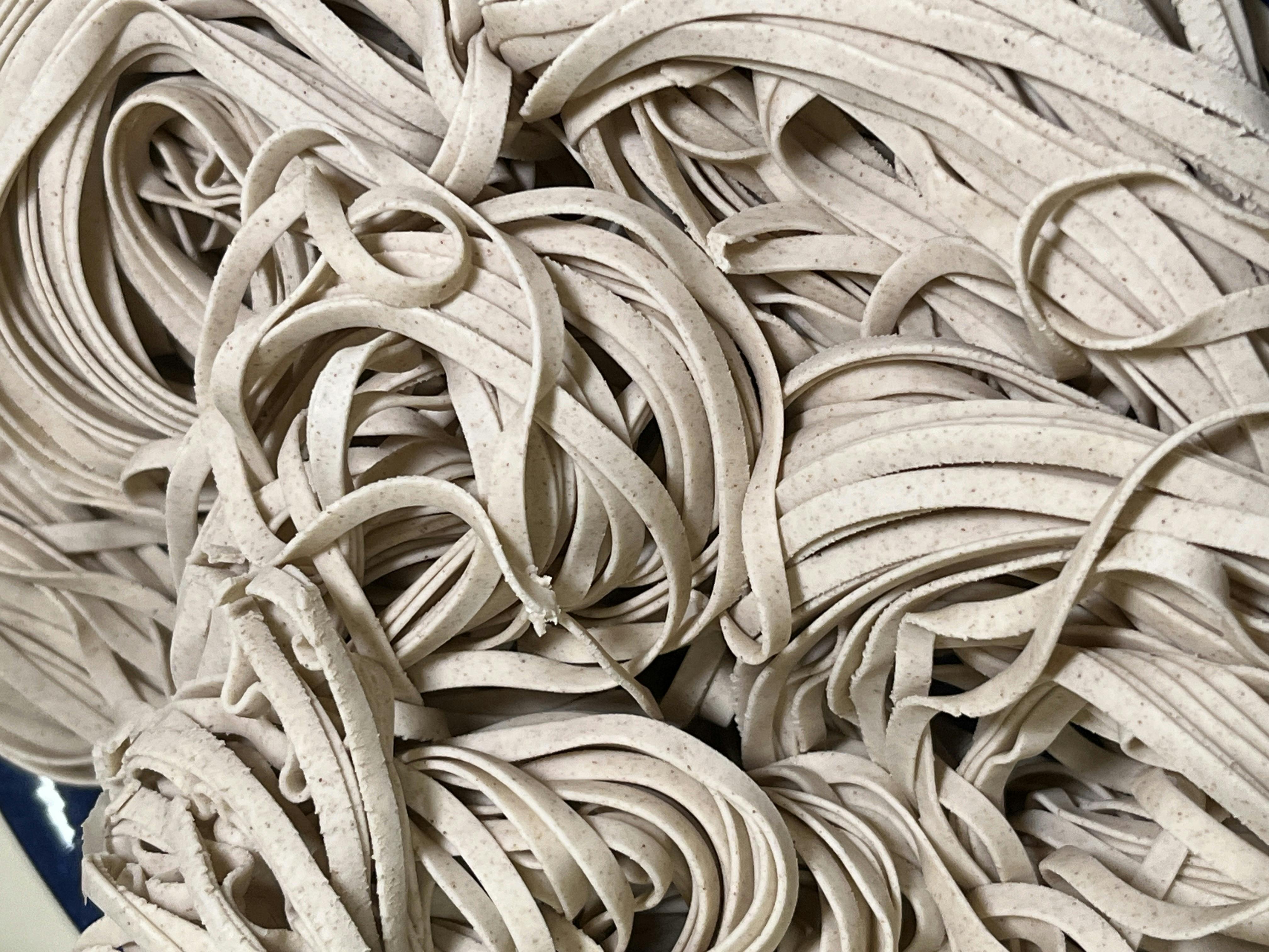 製麺が終了した状態。お蕎麦はパスタ用のブレンドと違ってくっつきやすいのですが、卵白を加えたことで、これまでよりはるかにくっつかなくなっています。