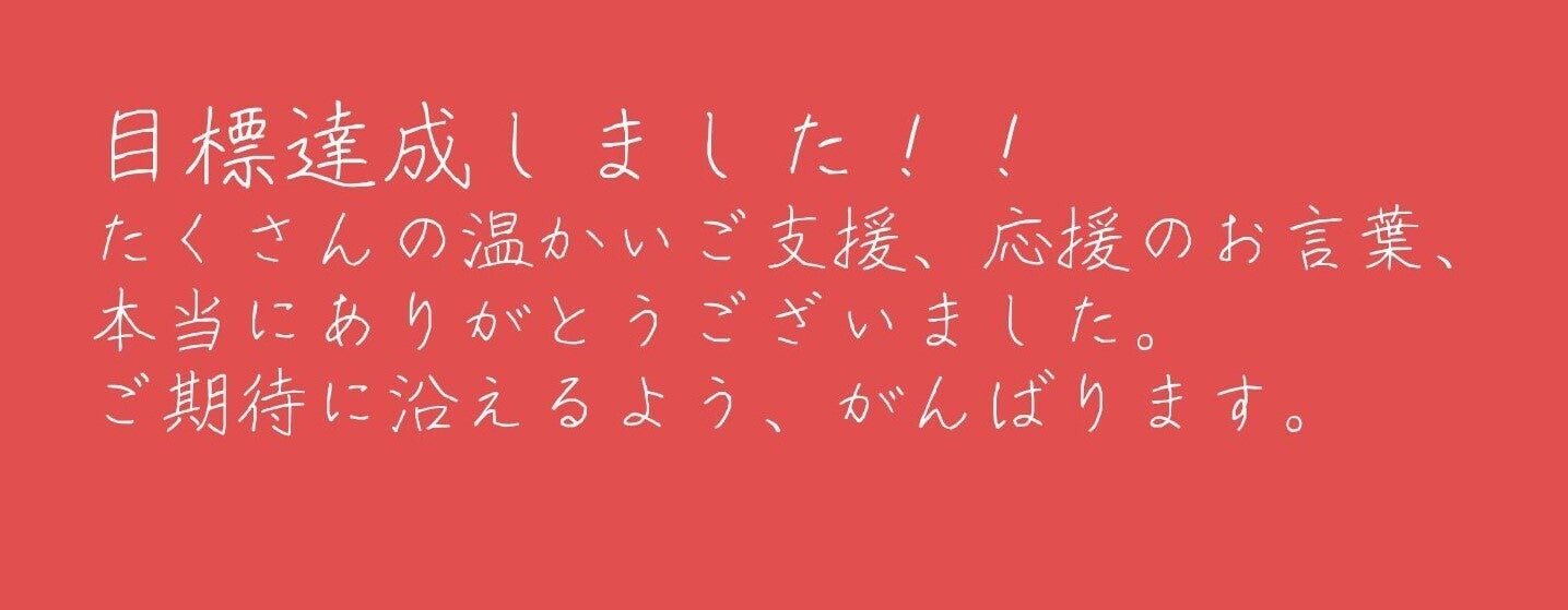 公開からあっという間の1ヶ月でしたが、たくさんの温かいご支援をいただき、無事に目標金額を達成することができました。言葉が見つからないくらい、感謝の気持ちでいっぱいです。