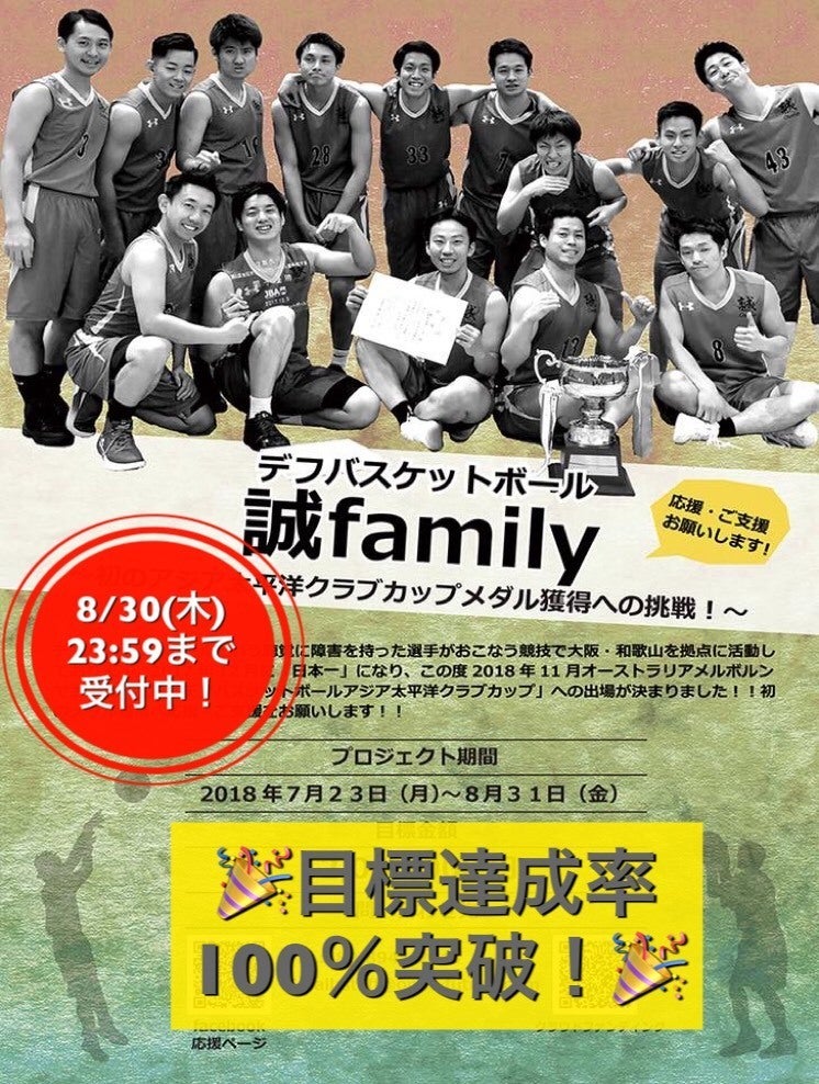 2018/08/31 12:52 誠family・クラウドファンディング!目標の200万を超過し、達成率108%、217万8千円でプロジェクト終了となりました。たくさんのご支援とご声援をいただきました事、チーム一同、心より感謝致します。ご協力ありがとうございました。クラウドファンディングを通じて多くの新たな出会いもあり、デフバスケットボールのさらなる発展と普及のため、誠familyは前へ進んで参ります。皆様からいただいたご声援を胸に、アジアクラブカップでは金メダル獲得を目指し大会へ臨みます。今後とも応援宜しくお願い致しますm(__)m もっと見る