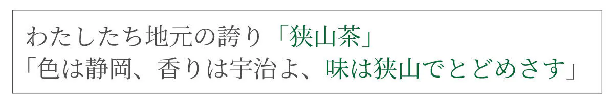 「色は静岡、香りは宇治よ、味は狭山でとどめさす」という歌もあるほど、甘くて濃厚な味を持つことで評価が高い。(農林水産省HPより)