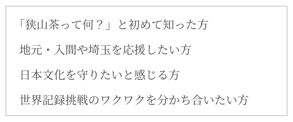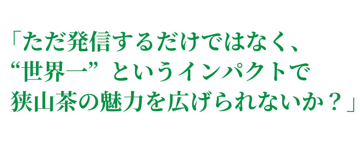 どうかこのプロジェクトに、あなたの想いを重ねてください。一緒に、“世界一”とともに、狭山茶の未来を作っていきましょう。