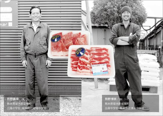 カードの裏面には、このこだわりの豚肉を作り上げた父義幸さんと、後を継ぎ事業を広げる息子の博崇さんの豚への愛情が溢れる会話が掲載されています。