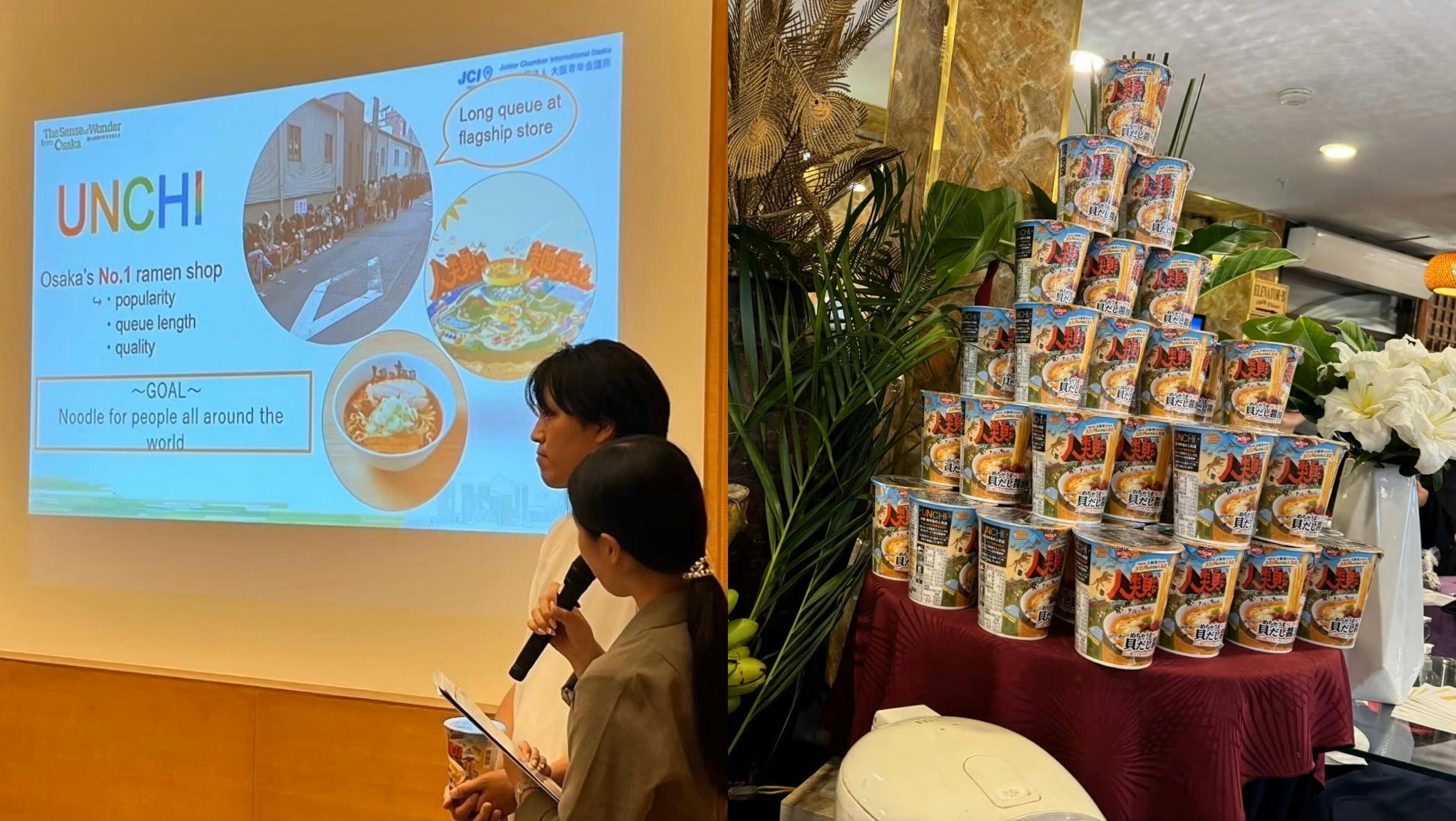 左:ビジネスプレゼンテーションの様子 右:現地企業との懇親会で提供した人麺カップ麺たち