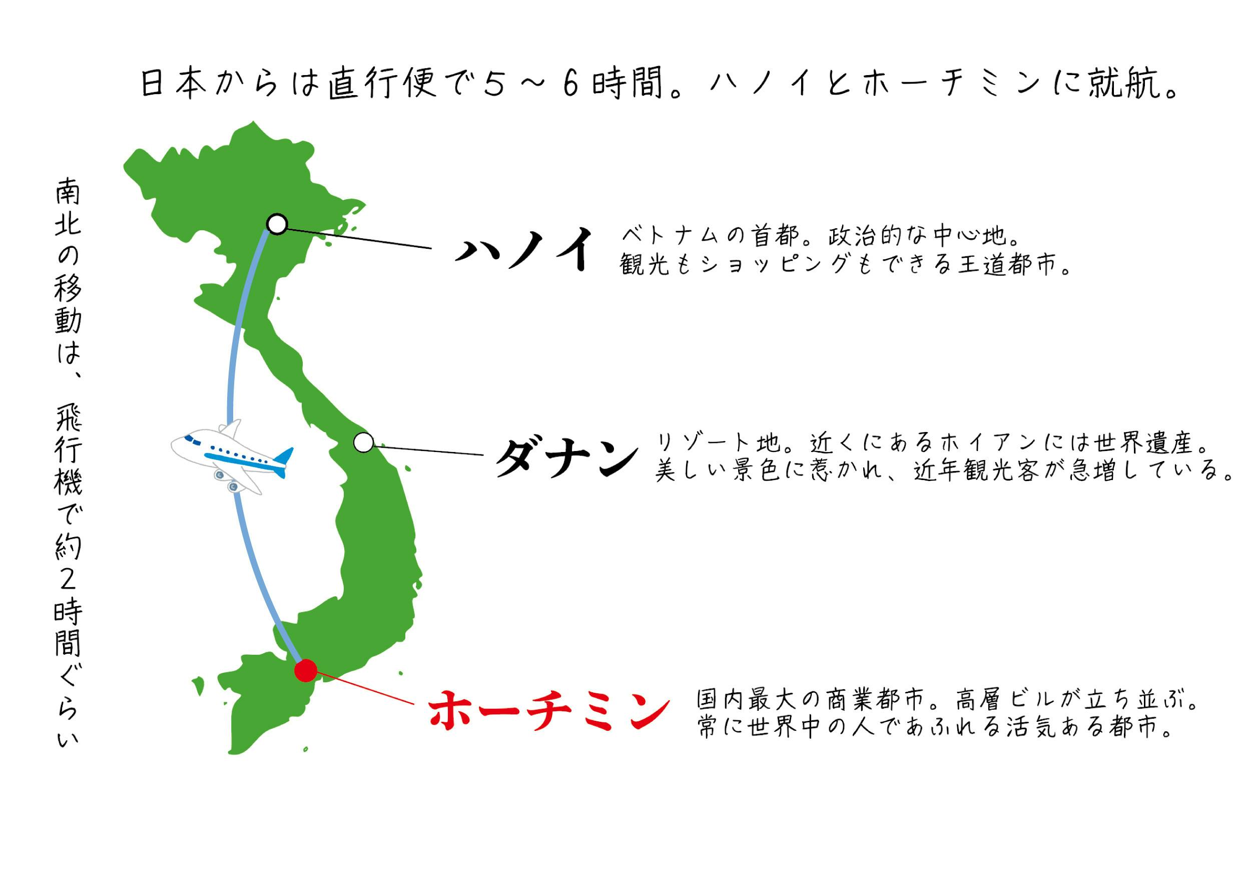 ベトナム(ベトナム社会主義共和国)は、カンボジア・ラオス・中国と陸路で接し、東南アジアのインドシナ半島東部に位置する、南北に細長い国家。北部に首都・ハノイ、中部にリゾート地・ダナン、南部に国内最大の商業都市・ホーチミン (旧・サイゴン)があります。