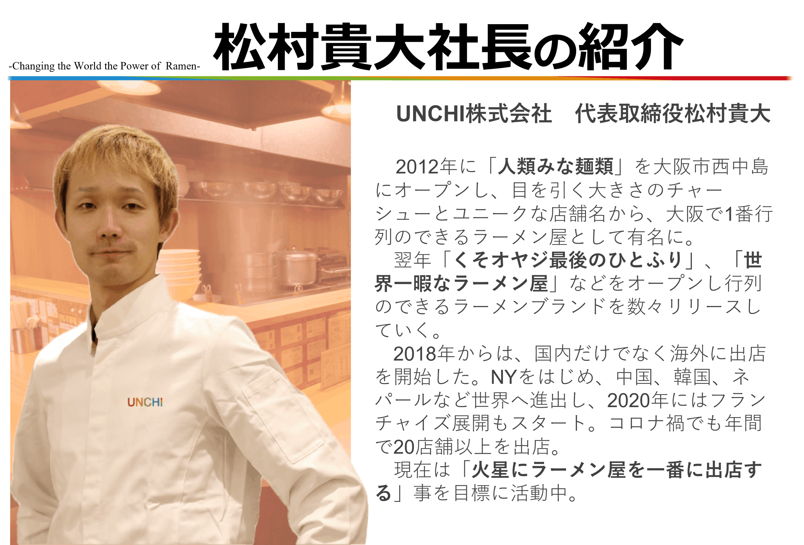 そしてこのプロジェクトに全面協力していただくのは「人類みな麺類」創業者 UNCHI株式会社代表取締役松村貴大社長です!