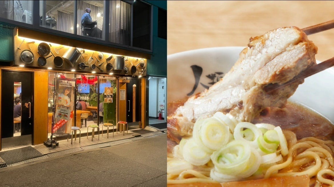 左:大阪・西中島の人類みな麺類本店 右:名物の分厚いチャーシュー