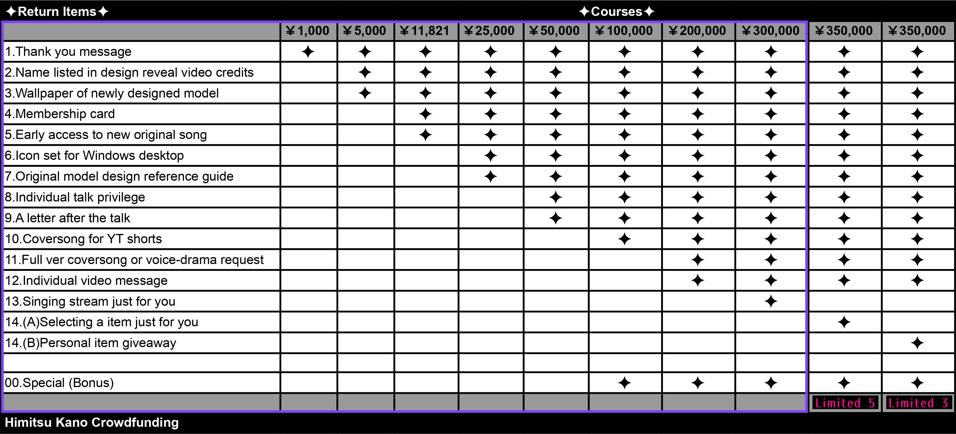 Himitsu Kano will give away a personal item to you! Though it won’t be expensive, it will be something cherished and used daily. You may receive a small item, accessory, book, or a piece of clothing. The item you receive will vary for each supporter. If you choose this course, your "8. Individual talk privilege" time will be extended by 5 minutes.