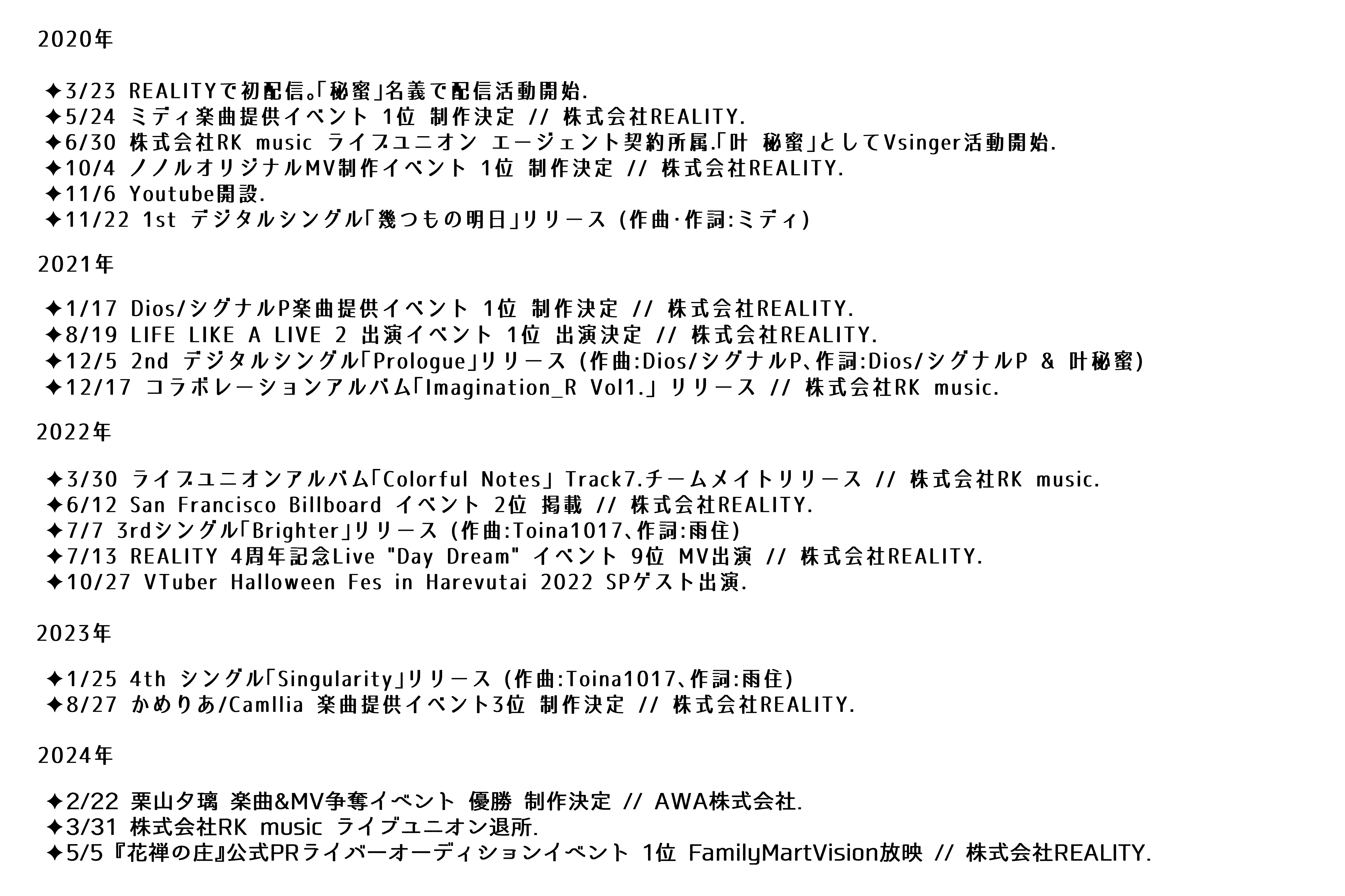 私は2020年3月アバターアプリ「REALITY」で配信活動を開始し、同年6月には株式会社RK Music ライブユニオンにてVsingerとしてデビューしてから、本格的に音楽活動をスタートしました。主にREALITYやYouTubeで、生配信や視聴者さんからのリクエストに添いながらオリジナルソングやカバーソングを披露しています。得意なジャンルは洋ロックですが、その他ポップスやアニソン、ボカロや昭和歌謡など、幅広い楽曲にも挑戦しています。