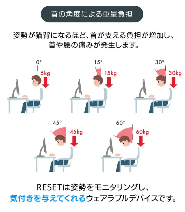 RESETの高精度全方位センサーを使用した姿勢監視システムを使用すれば、首の角度からくる「肩」や「腰」の辛い症状を未然に防ぐ効果も期待できます。普段は意識しませんが、頭の重さって実は約5キロもあるんです。