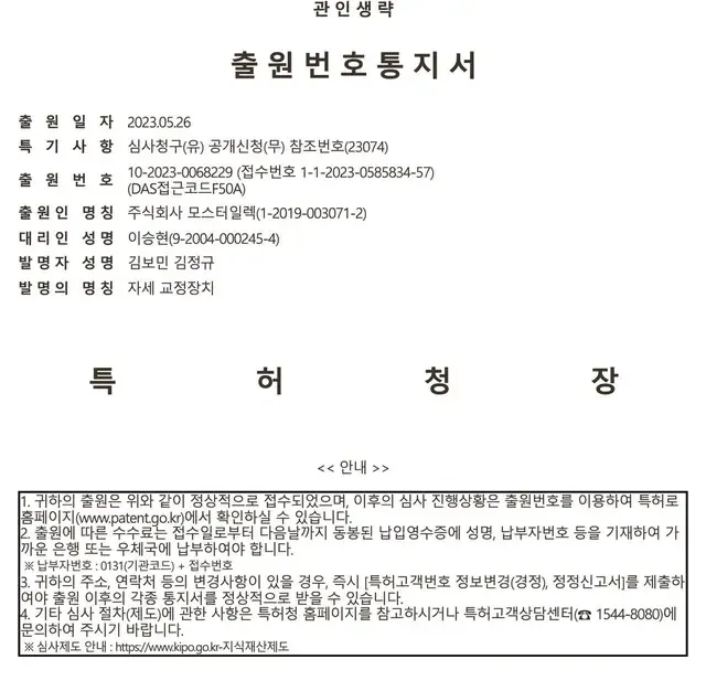 韓国語で読めない方も多いと思いますが、RESETの姿勢監視技術についての出願内容(受付番号:1-1-2023-0585834-57)が記載されています。(支払い方法など具体的なことも書かれていますので、詳細は割愛させていただきます。)