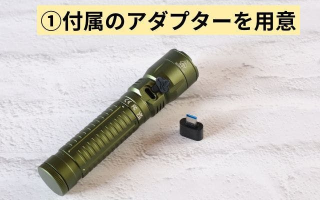 ②付属のアダプターを懐中電灯本体の充電ポートに挿す
