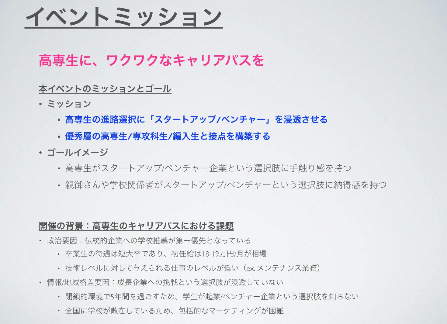 多くの起業家やCXOを生み出しているにも関わらず、なぜ高専はこのような状況にあるのでしょうか?私たちは、学生が「学校推薦」以外の就活チャネルを持っていないことが原因であることを突き止め、それを打開するためにこのプロジェクトを推進しています。中学卒業後の5年間を技術と課題解決能力の研鑽に費やし、世界を変えるポテンシャルを持つ高専生に、もっと挑戦の機会を提供することが、このプロジェクトのミッションです。