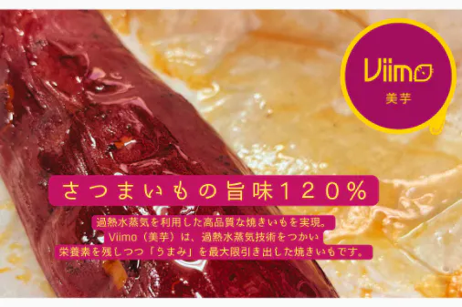 私たちは現在も第4次ブームが続き老若男女に愛されている焼きいもにフォーカスし過熱水蒸気を利用した焼きいも製造装置をつくり独自の製法でどこにもない栄養素そのままの高品質の焼きいもを「美芋(Viimo)」と名付け、製造し市場への投入をします。