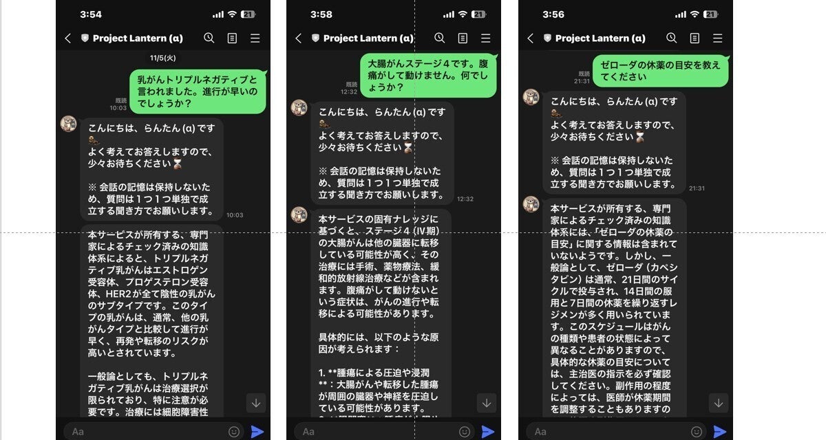 ◆現在、これらのコンテンツや最新の医療情報、基本的ながん情報を知識ベースとした、生成AI対話型システムのプロトタイプ版(Lantern_0.25)をクラウドファンドにあわせてLINEとWEBサイトで公開しました。