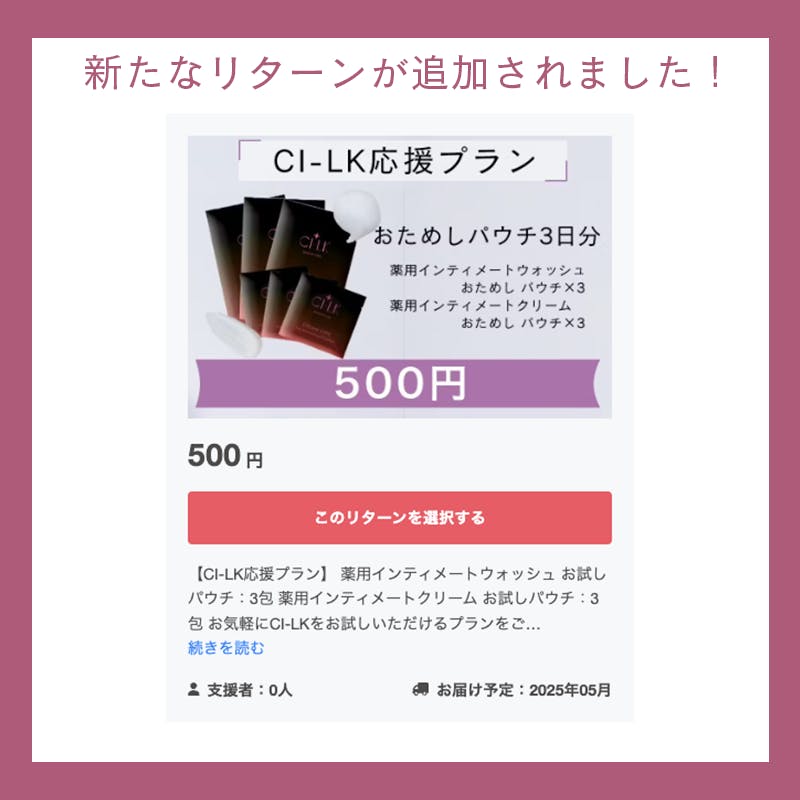 こんばんは!CI-LK責任者のリリーです!いただいた質問の中でも多かった「黒ずみ」に関する内容について回答します!Q.デリケートゾーンの黒ずみに効くって本当ですか?A.はい!もちろん効果的です!美白*有効成分である《ナイアシンアミド》や《3種のビタミンC誘導体》、《プラセンタエキス》などなど、黒ずみにアプローチできる成分を多数配合しています!ただ、使用方法を間違えると悪化させてしまう可能性があります....なので、効果的な使用方法を徹底解説します!!まず、デリケートゾーンの黒ずみの原因は下着やケア中の摩擦による乾燥、デリケートゾーンの汚れ、古い角質によるものがあげられます。そのためケア方法として、一、摩擦を起こさない一、絶対に乾燥させない一、たっぷり使うこの3点を意識してください!具体的な手順としては、1.「CI-LK 薬用インティメートウォッシュ」で外陰唇汚れや古い角質をやさしく洗い流す ※この際摩擦が起きないよう、4〜5プッシュほど手に取りたっぷりの泡であらってください!2.「CI-LK薬用インティメートクリーム」を外陰唇に塗布する。美白*効果のあるナイアシンアミド配合の贅沢クリームがデリケートゾーンへの摩擦による乾燥を防ぎます。ただ、黒ずみを短期間で治すことはかなりむずかしいので、継続していただくのがオススメです!デリケートゾーンの黒ずみだけではなく、おしりや肘、膝、脇などの黒ずみにももちろん効果的です!ぜひ、黒ずみが気になる箇所全身にお試しください♪たっぷり使うためにも今回のクラウドファンディング限定価格をお見逃しのないようにしてください!!【リターン一覧】いただく質問の中でも多い「黒ずみ」に関するお悩み...一緒にケアして健康美白*目指しましょう(*^^*)♡CI-LK責任者 リリー*汚れや古い角質による