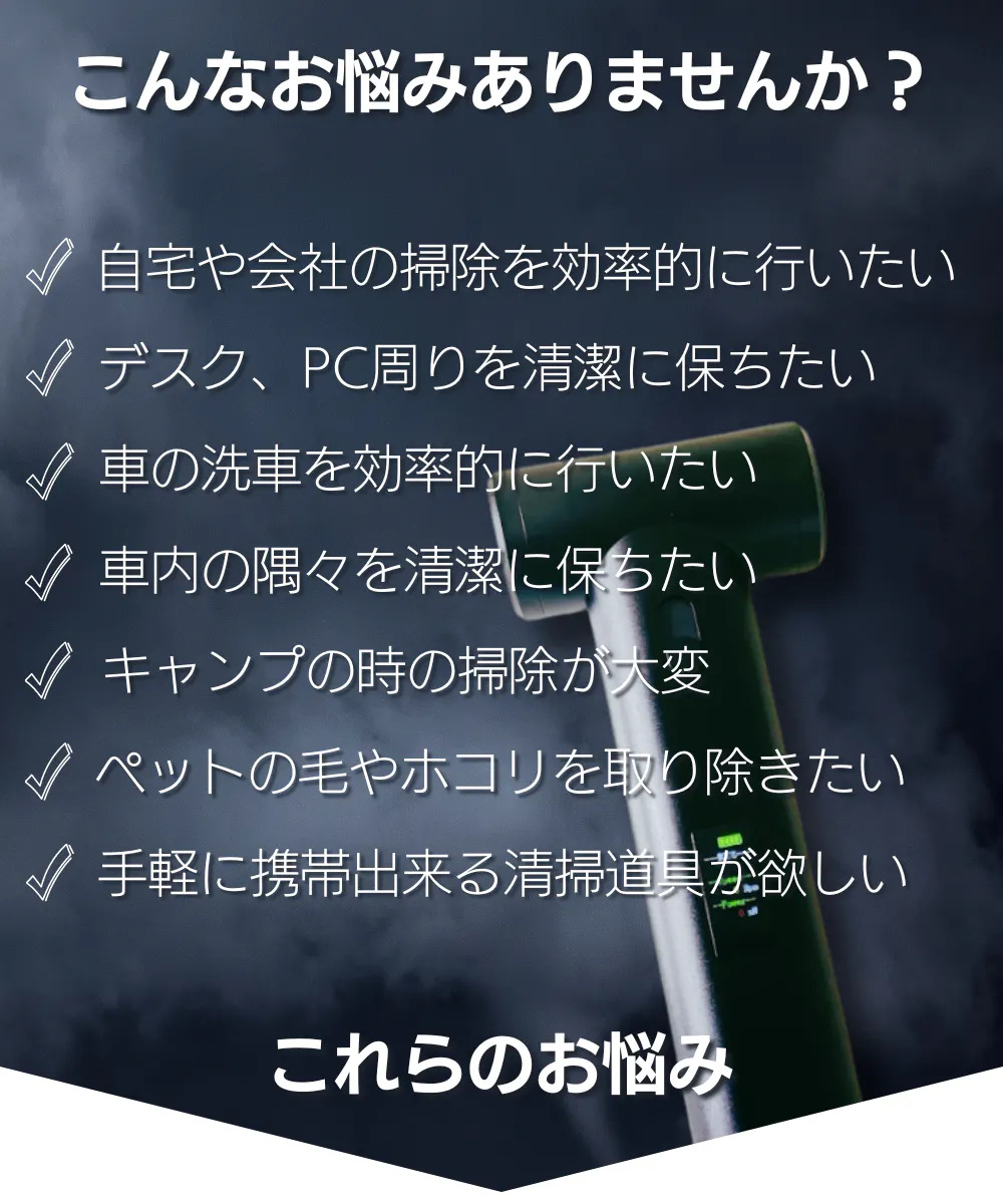 車内の清掃に大変便利。ホコリやゴミ、お菓子の食べカスなどを直ぐ掃除できます。専用ノズルで狭い場所もサッと綺麗に。