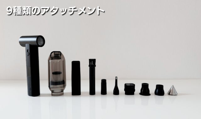 付属品:アタッチメントノズル8種類+ガラスブレーカー1個・USB-TypeC充電ケーブル・HEPAフィルター×4個(内3個プレゼント)・収納袋・取扱説明書