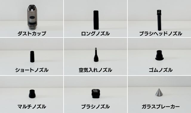 8種類のアタッチメントノズルとガラスブレーカーを使用。