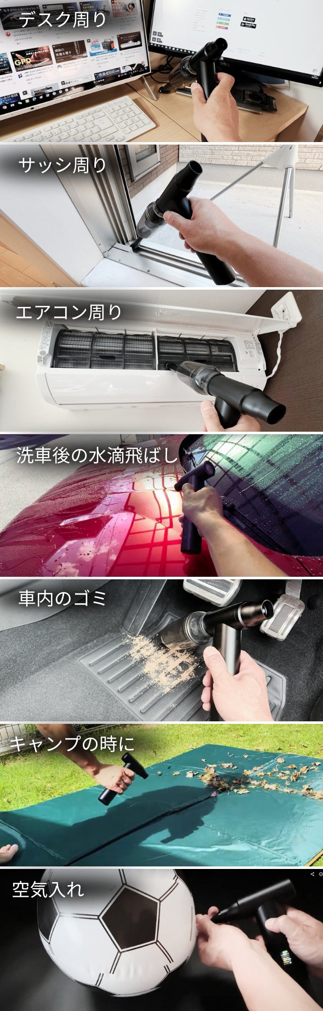 車に装備して車内清掃や洗車の時の水滴飛ばしに。洗車時のタオルで拭きにくい屋根の部分や狭い部分の水滴を取るのに大変便利、特にパーツの隙間の水滴はそのままにしておくと錆びや水垢の原因になるので「AIRDAST MAX」で水滴を吹き飛ばしていただくと車も末永く綺麗に保てます。