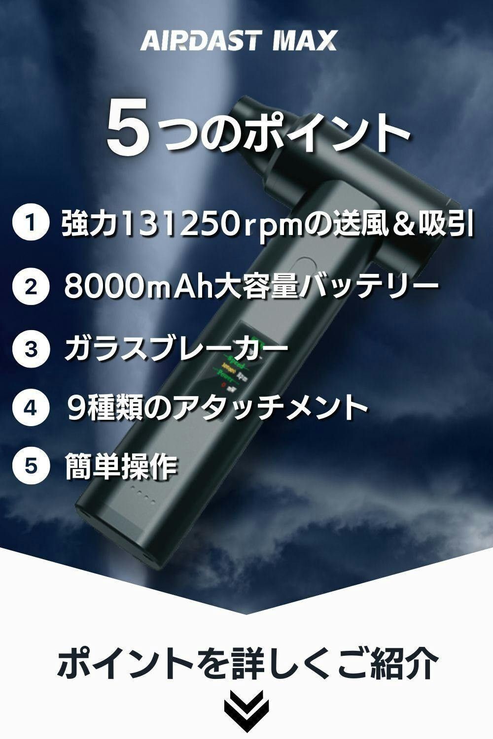 今回、「AIRDAST MAX」をmachi-yaだけの特別価格にてご提供させて頂きます。「AIRDAST MAX」は2WAYハイパワーエアダスターで強力な送風と吸引力を持っております。またコンパクトで軽量なのでどこにでも携帯出来ます。この「AIRDAST MAX」が一つあれば日常生活のあらゆる場所で使うことができ、あなたの生活をもっと快適に出来ることは間違いありません。自信をもってお勧めします。実用性が有り、洗車やアウトドアにも役に立つ「AIRDAST MAX」を皆様にお届け出来るのを楽しみにしております。是非、あなたの相棒として側に置いていただけたら幸いです。精一杯プロジェクトに取り組んで参ります。皆様からの応援を心よりお待ちしております。