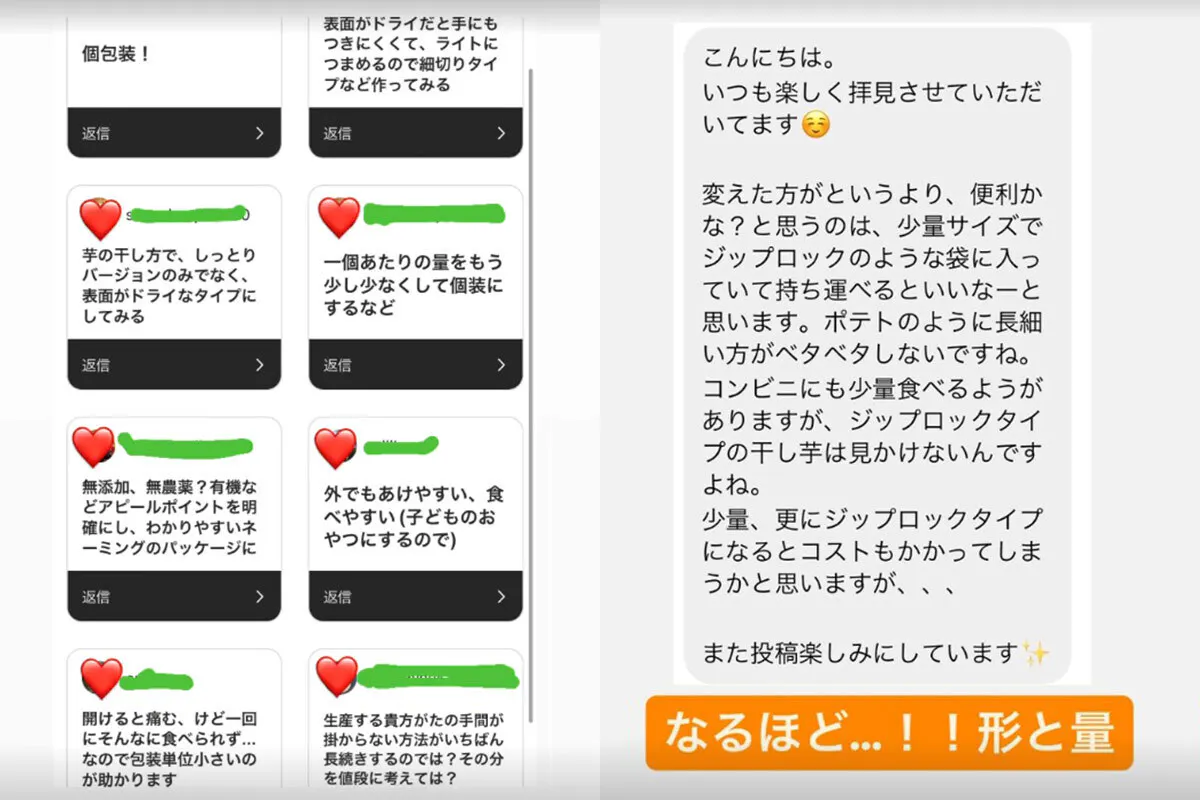 結果、美容やダイエットに適した特徴がある干し芋ですが、食べづらさや持ち運びの不便さを感じている方が多いという結論に達し、ロゴやパッケージデザインなど、アイデアをいただきながら完成したのが...