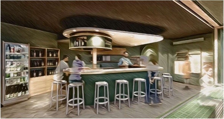 こちらは内装のイメージです。海で知られる葉山ですが、山と森の美しさをイメージとして深い緑を外装・内装共に使っています。お散歩や海上がりでも気軽に立ち寄っていただきやすい造りを心掛けています。