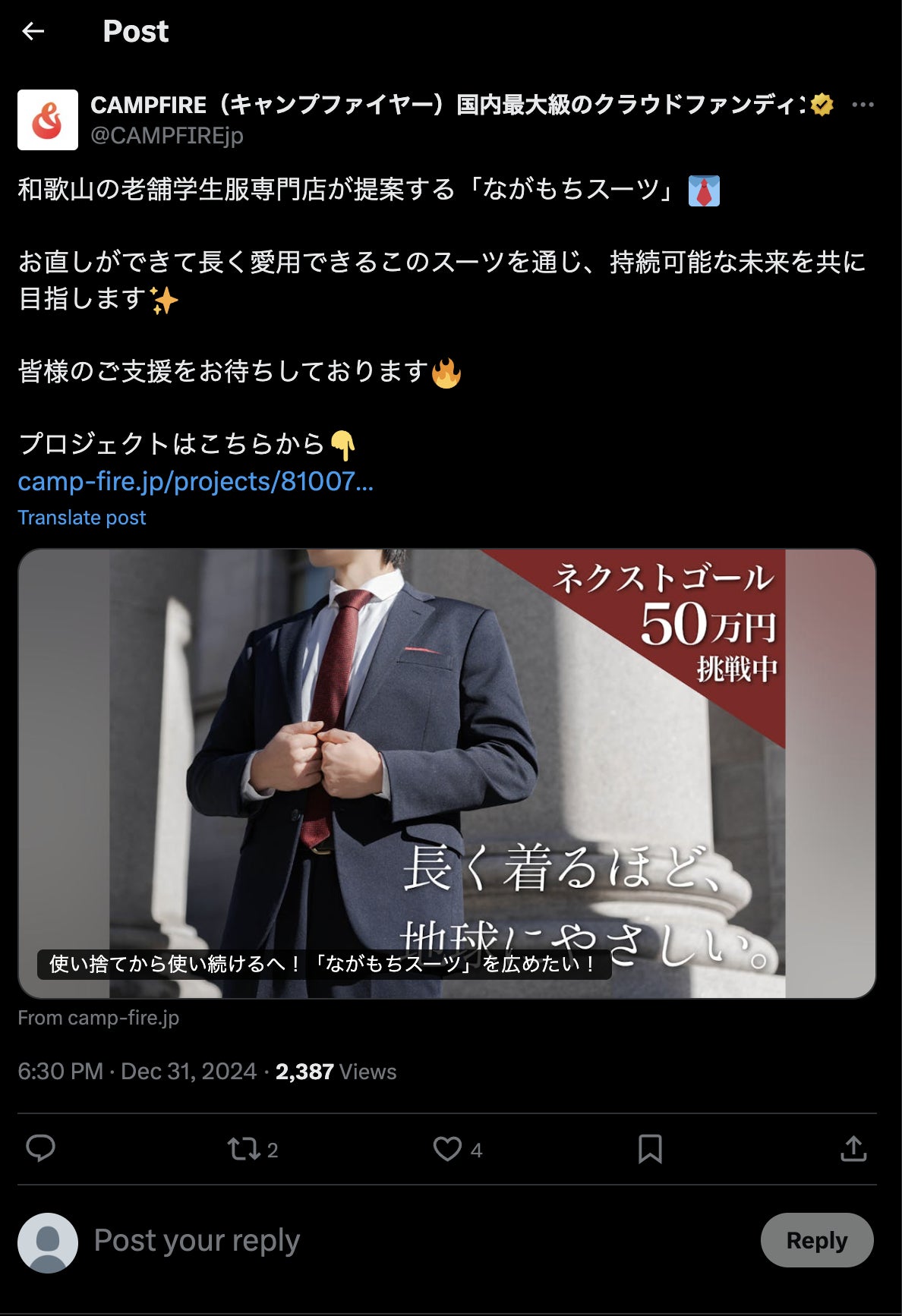 2025/02/01 12:45エイコーコジマを応援いただきありがとうございました!!おかげさまで大成功で終えられることができました!※「目標設定低すぎちゃうんか」は胸の内にしまっておいて下さい笑学生服専門店というマニアックな業種の中で当たり前に行われている色んなことが、今の時代にマッチしていると感じ、今回のクラファンに至っております。良いものを長く使うコンセプトに今後も色々と商品展開していきたいと思っています。ご意見やご指摘から商品開発やアップデートに繋がりますので、引き続きつながってもらえたら嬉しく思います。今回は本当に色んな繋がりを再認識させてもらってとっても幸せでした。みんなありがとう!!!!!!!!!!!!!!!!!!!!!負けずに頑張ります!!!!!!!!!!!!!!!!!!!! もっと見る