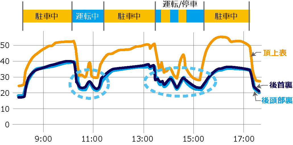 車の運転中、冷房が入ると、後頭部がヒンヤリ、周辺より数℃温度が下がることが分かります。
