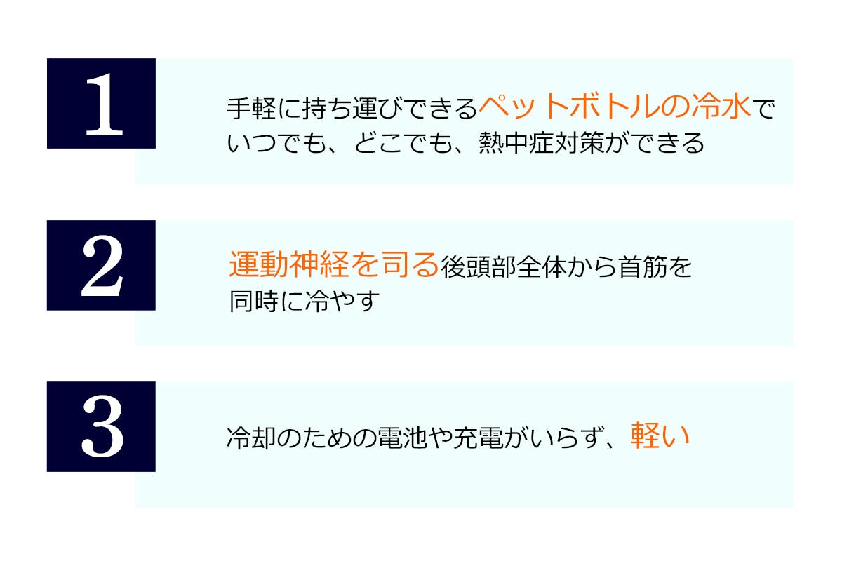 どこでも注水ができ、わずか50mlの水で2〜3時間、後頭部から首筋を冷やすことができます。
