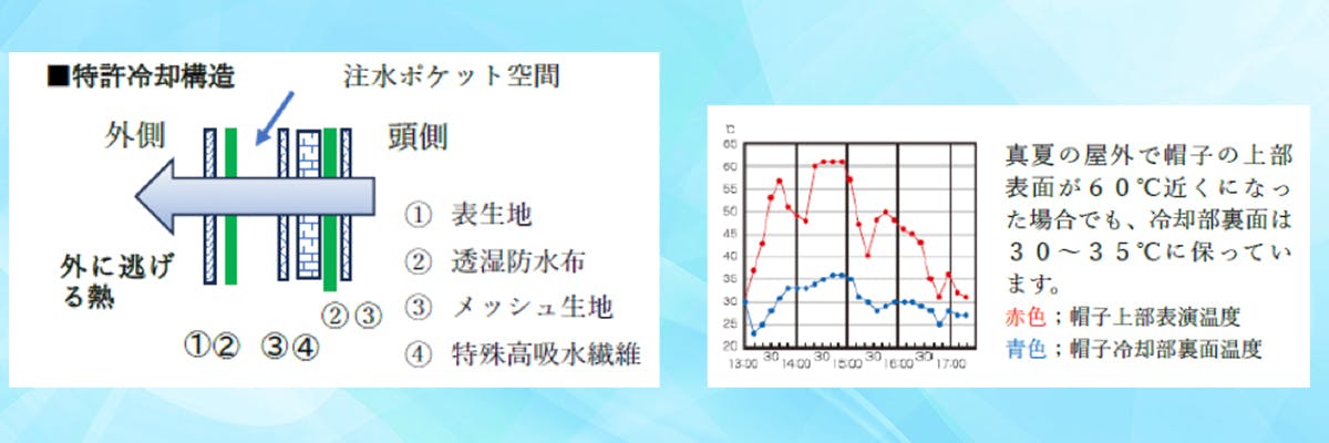 世界中ここにしかない注水ポケット式 特許構造の冷える帽子 です。