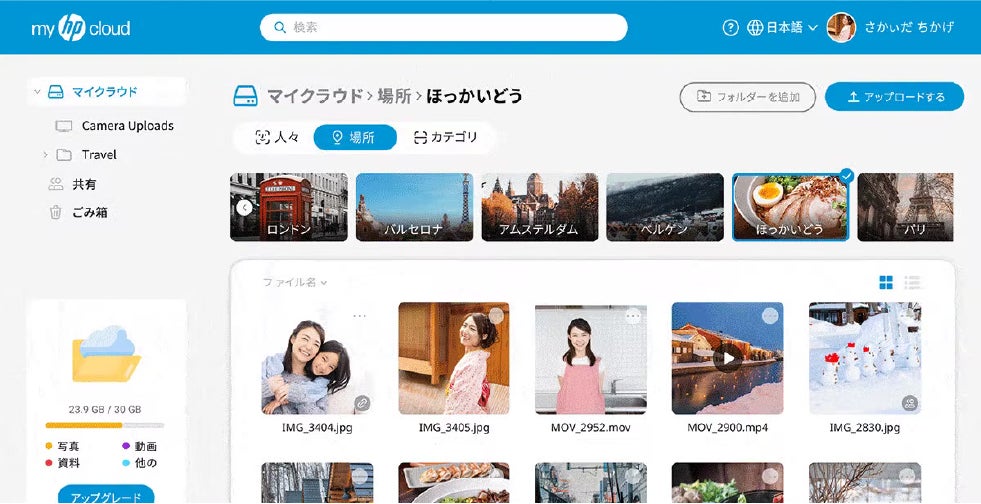 myHPcloudでは写真だけでなく、動画やワード、エクセルといった様々なデータも自動で整理されます。