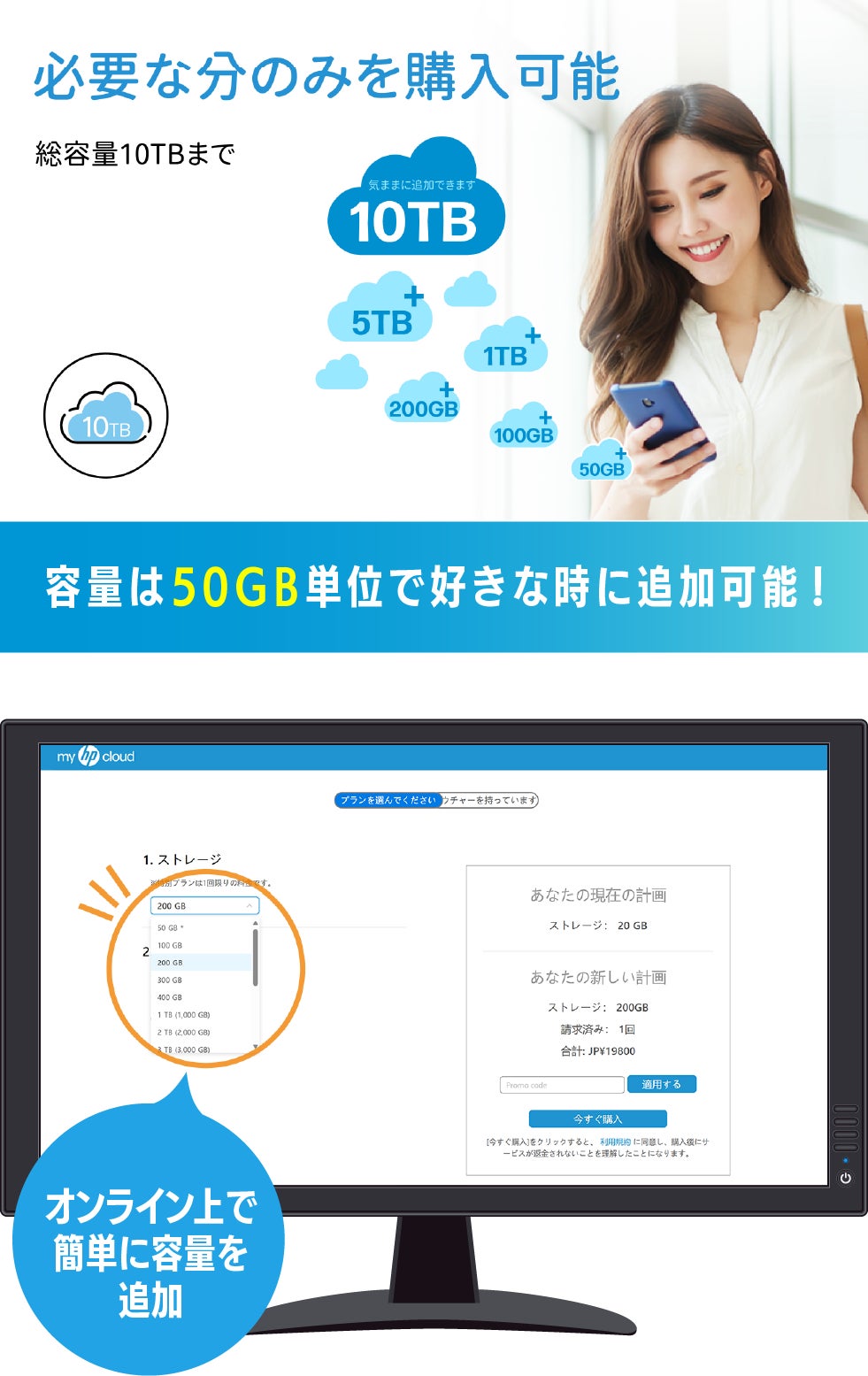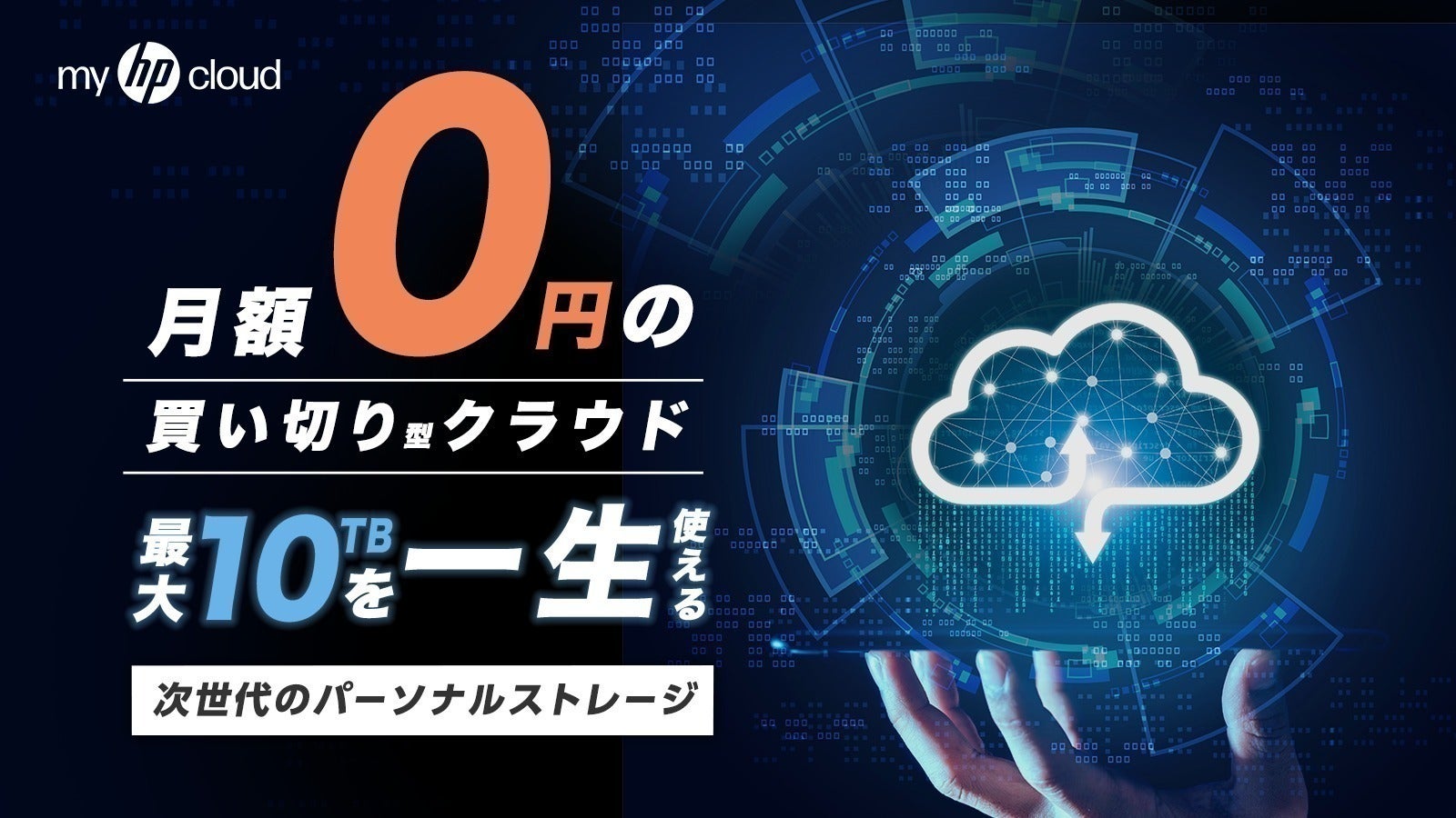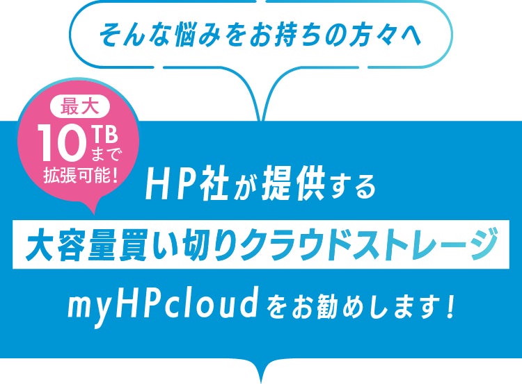 HP(ヒューレット・パッカード)社が提供する『myHPcloud』は、あなたの使用状況にあわせて、最大10TBまで柔軟に拡張できる、買い切り型のクラウドデータ管理サービスです。