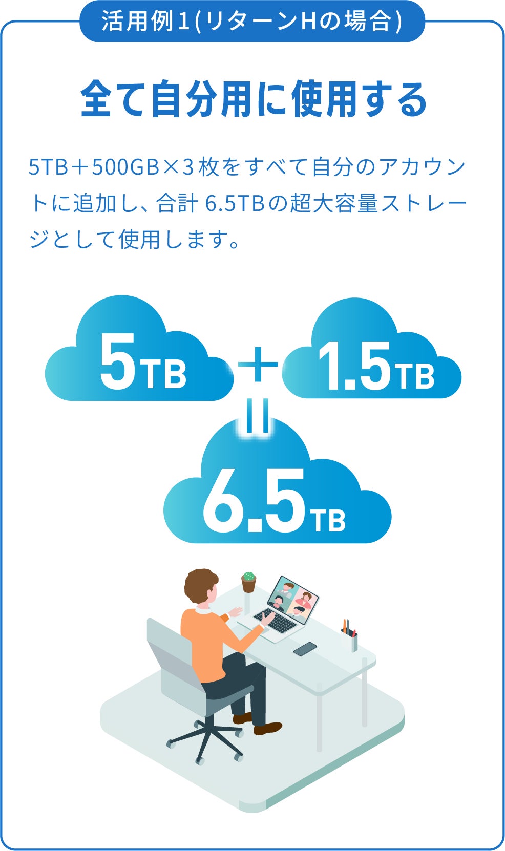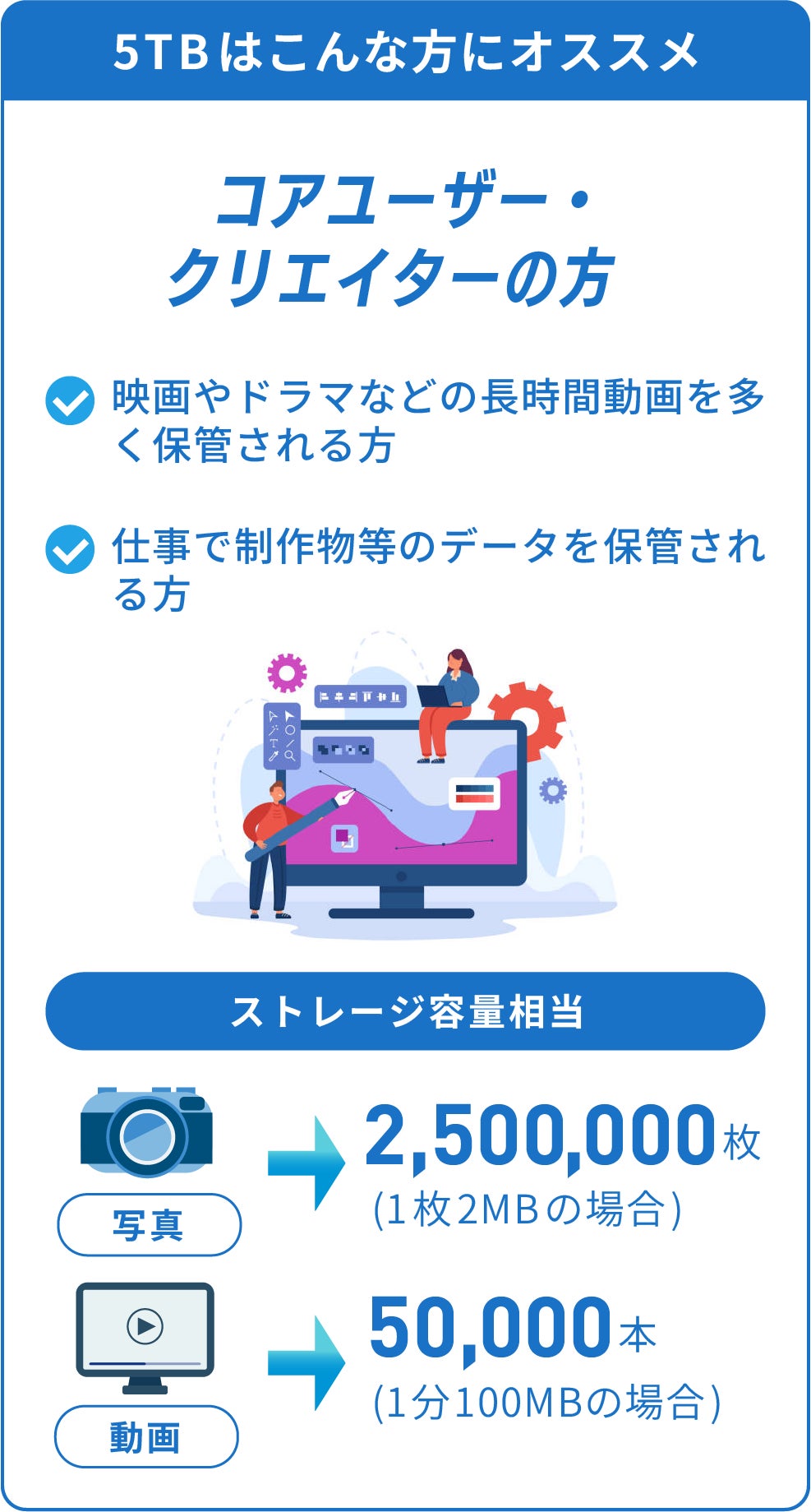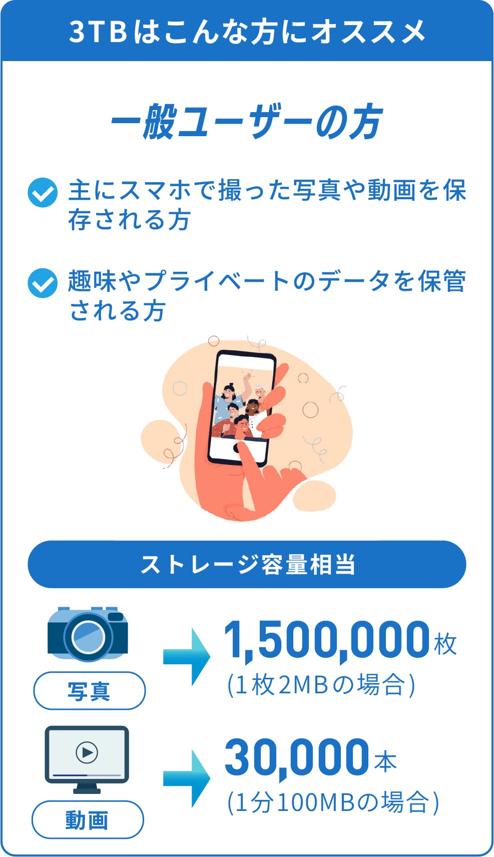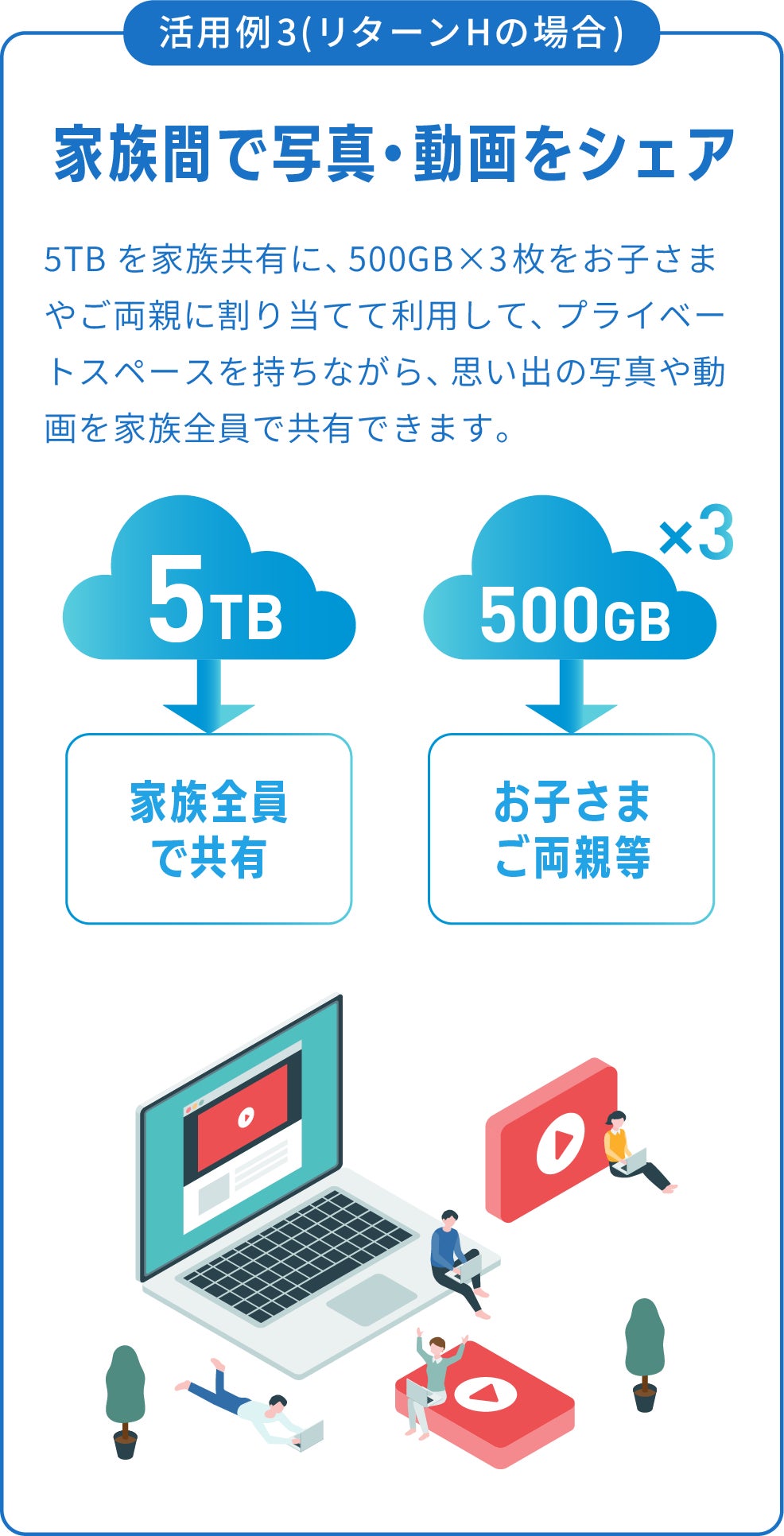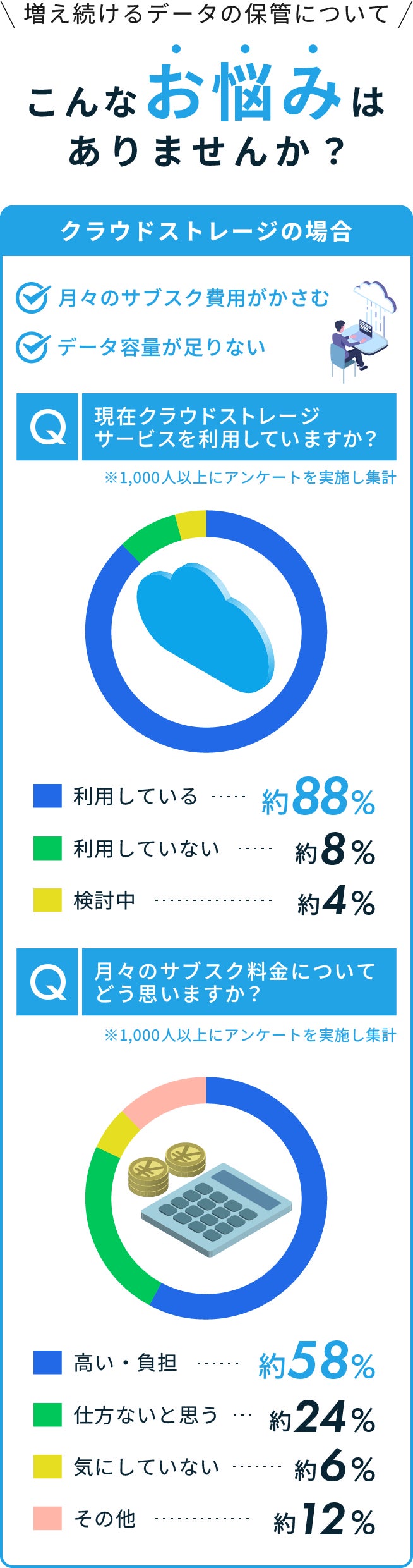 様々なタイプのユーザーの平均データ使用量を基に設計された3TB・5TB買い切りクラウドストレージ。