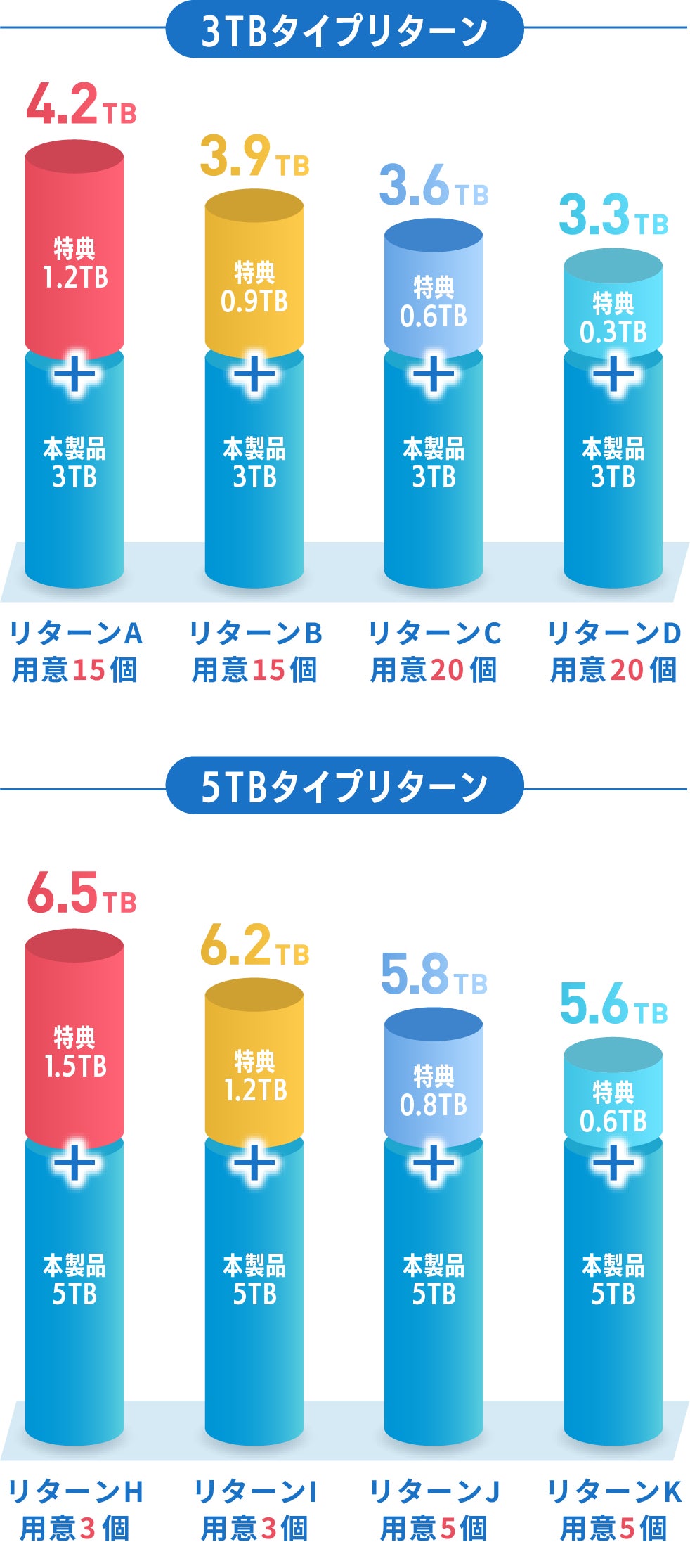 リターン特典として、基本容量(5TB・3TB)に加えて、さらに追加容量をインストールできる商品カードをプレゼント致します。