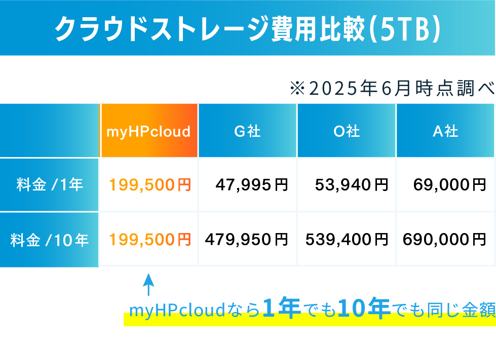 myHPcloudの最大の特徴は、生涯にわたるクラウドストレージの費用を圧倒的に抑えられる点です。