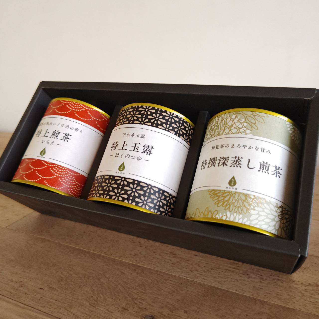 茶葉にこだわりたい方へ贈る、厳選3種のセット。伝統文様をあしらった和紙缶はお部屋やテーブルに置いておくだけで華やかな和の雰囲気が漂います。深蒸し茶のまろやかさと旨味と甘みの濃い味わい。宇治煎茶の上品な甘みと特上煎茶らしい爽やかな苦渋み。抹茶入り玄米茶の香ばしさ。急須で淹れて最後のひとしずくが注がれるまで、ゆったりとした癒しの時間が流れます。ご家族やご友人へのおもてなしに最適なお茶ばかりです。