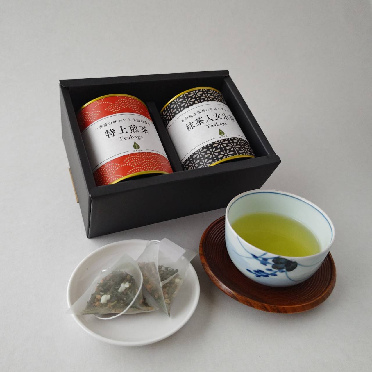 伝統文様をあしらった和紙缶はお部屋やテーブルに置いておくだけで華やかな和の雰囲気が漂います。いつでも手軽に日本茶の美味しさを楽しめるティーバッグセット。厳選した宇治緑茶のうま味と甘みでリラックス。玄米のこうばしい香りとさっぱりとした味わいに宇治抹茶のまろやかさをブレンドした逸品です。